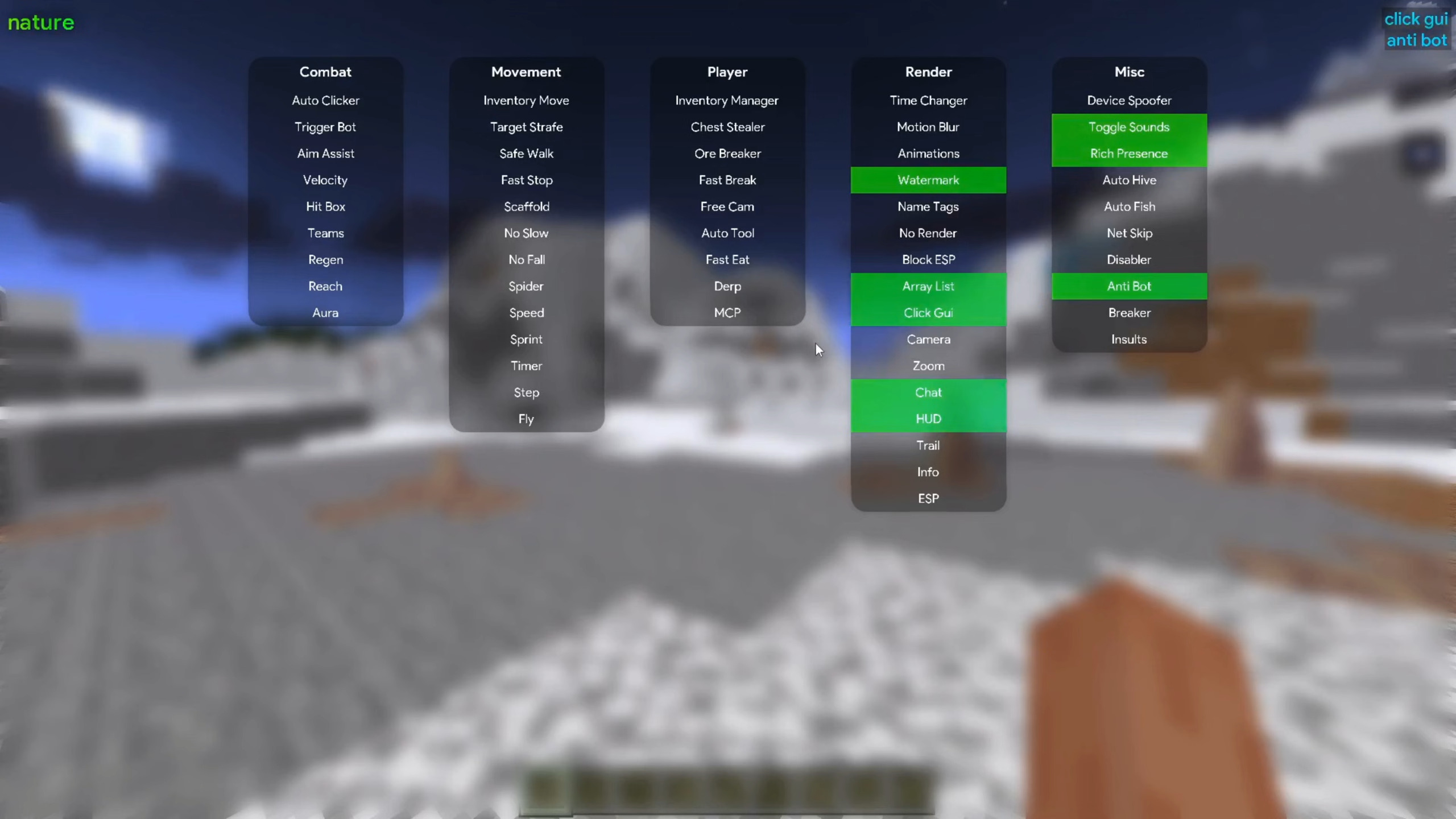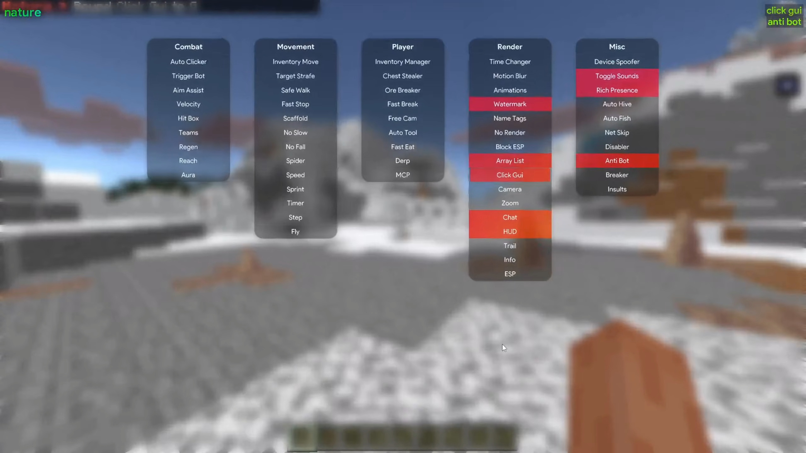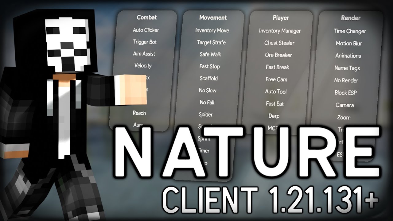 Nature Client (1.21.131+) for MCPE/Bedrock provides combat, movement, and utility cheats via a clean ClickGUI, making it popular for PvP, trolling, or singleplayer enhancement.