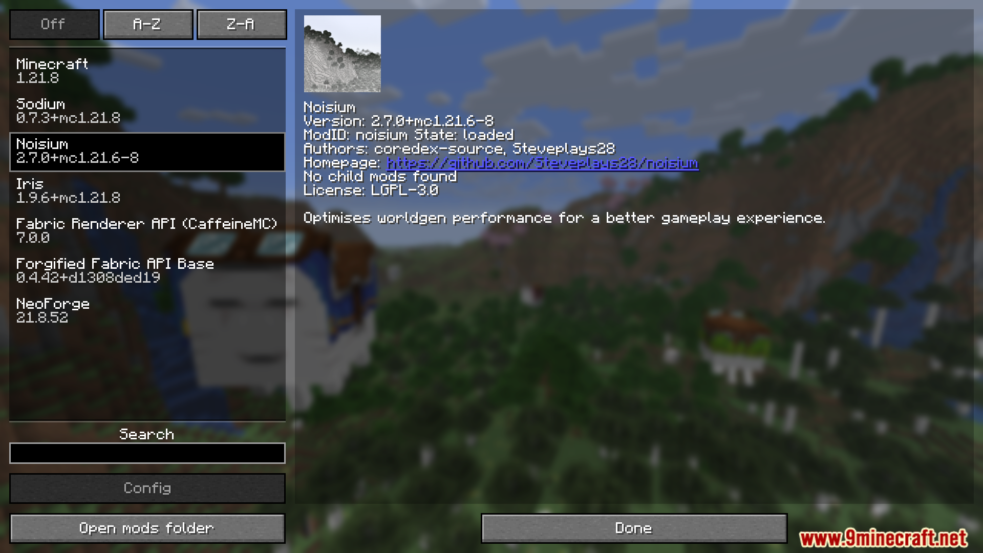 Noisium Forked Mod (1.21.11, 1.21.8) is a fork of the original Noisium mod. It specifically targets noise functions used in Minecraft’s world generation (terrain, caves, biomes, etc.), which are often computationally heavy. By optimizing these calculations, the mod reduces lag spikes and improves overall performance, especially in modded environments where worldgen is more complex.