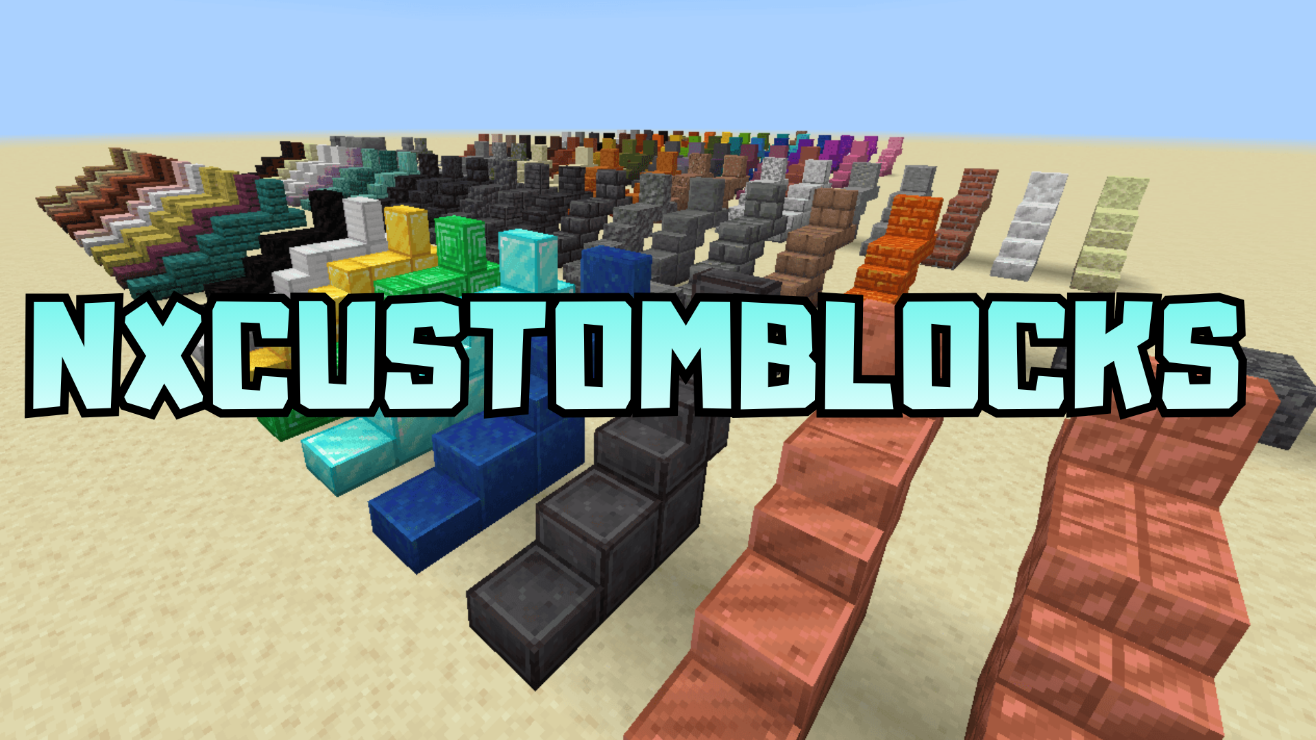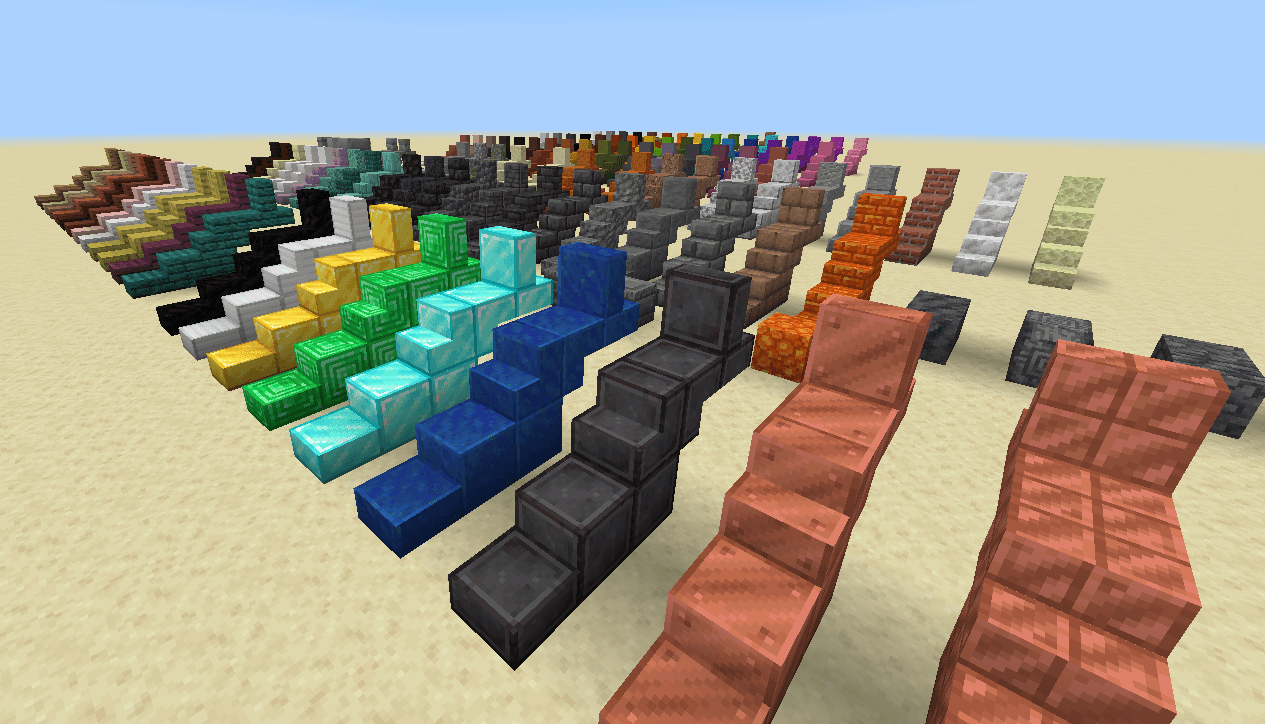 NXCustomBlocks Addon adds 5 new block types: stairs, slabs, vertical slabs, columns, and large blocks. The new blocks are made from a variety of materials such as concrete, fired clay, wool, wood, and even grass. All items have crafting recipes available in the crafting table or stonecutter for easy use.