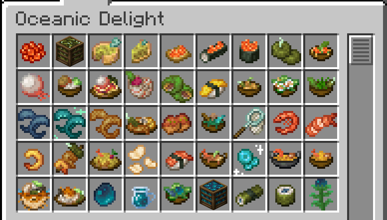 Oceanic Delight Addon (1.21) focuses on new ocean-related foods, plants, and mechanics. Content includes the addition of ingredients like shrimp and sea grapes, and tools like fishing nets. Dishes draw inspiration from East Asian and Mediterranean cuisine, and new recipes enrich cooking with marine resources.
