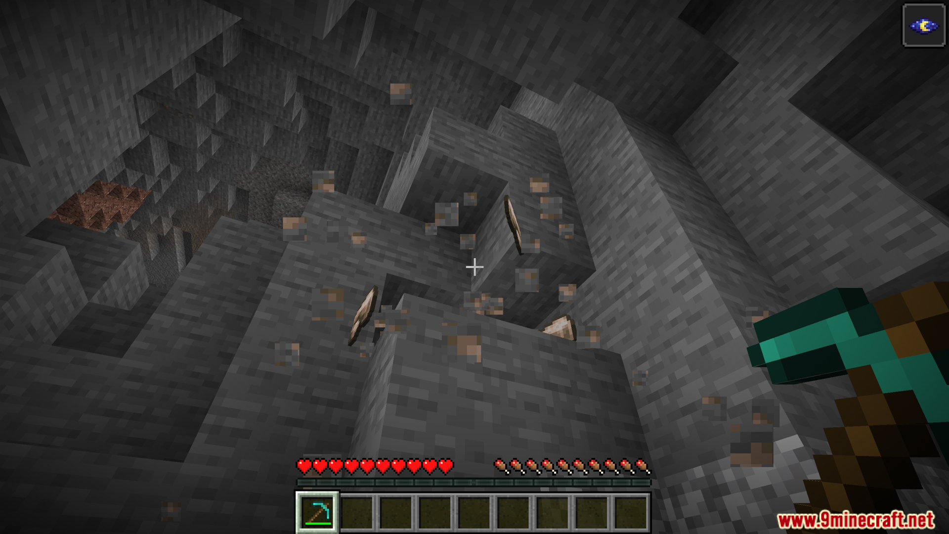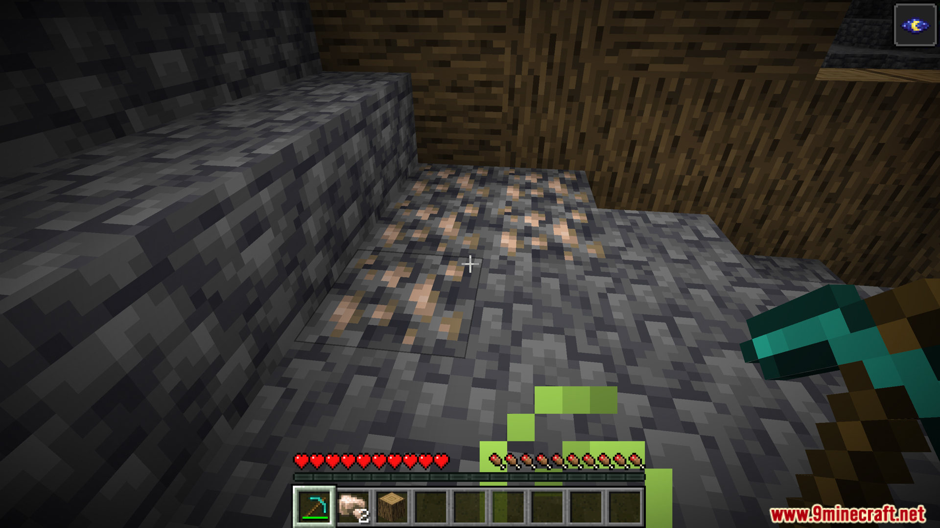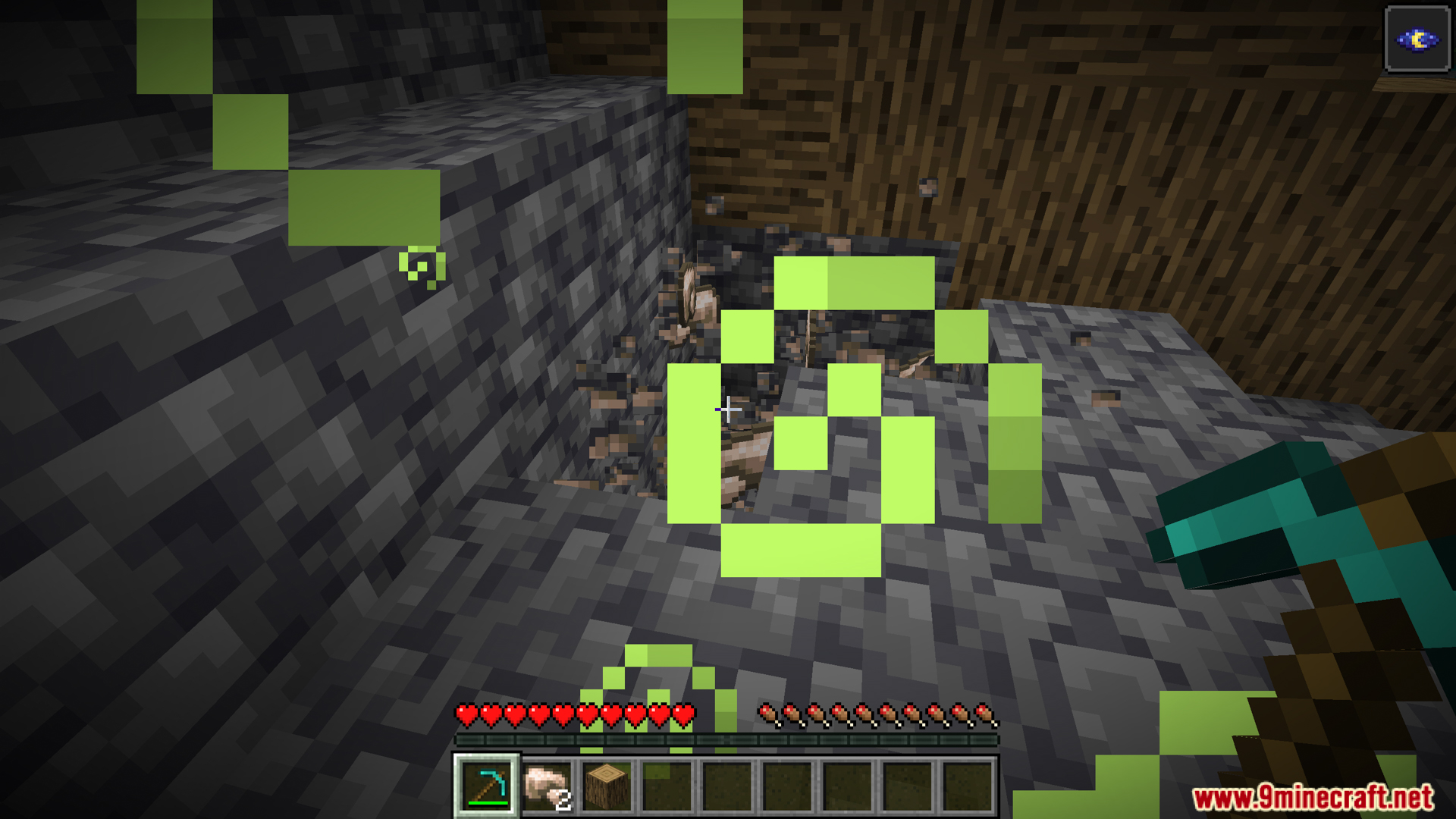 - When you crouch/sneak and destroy an ore block with a pickaxe, the mod will immediately destroy all ore blocks of the same type connected to that block.