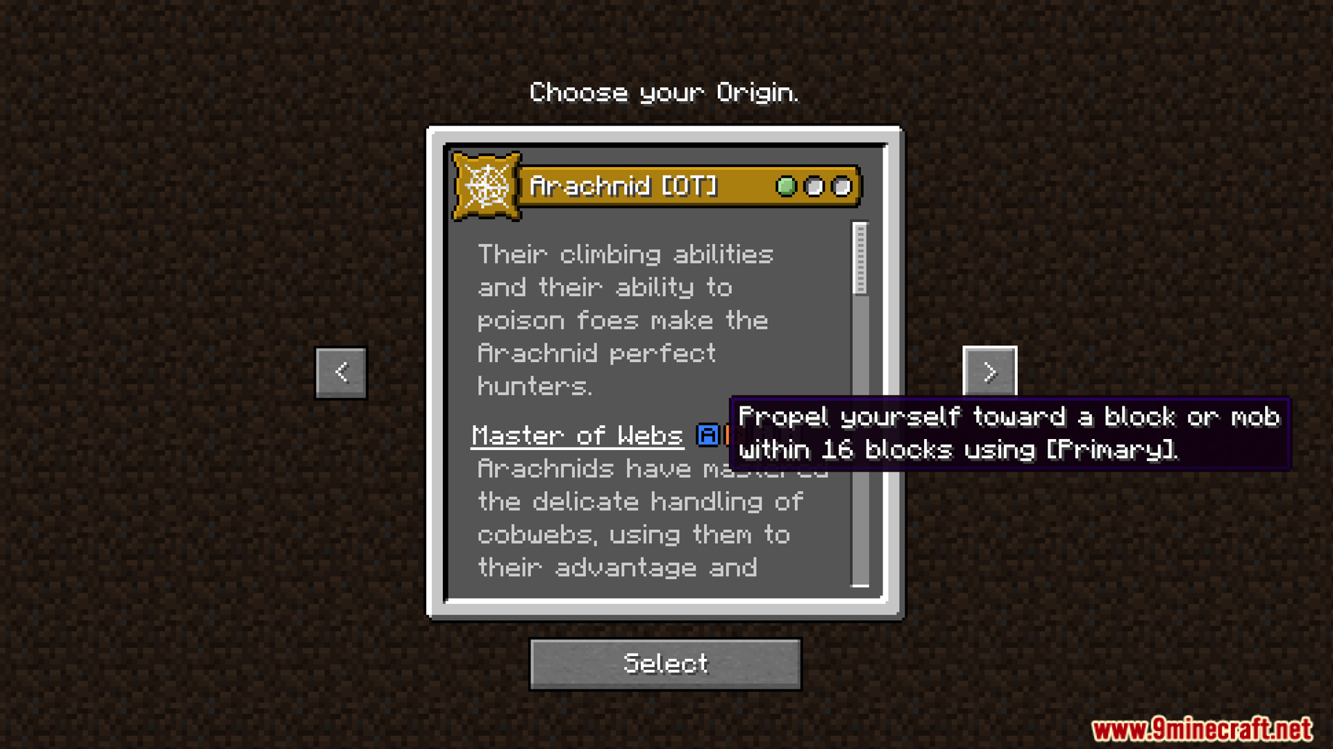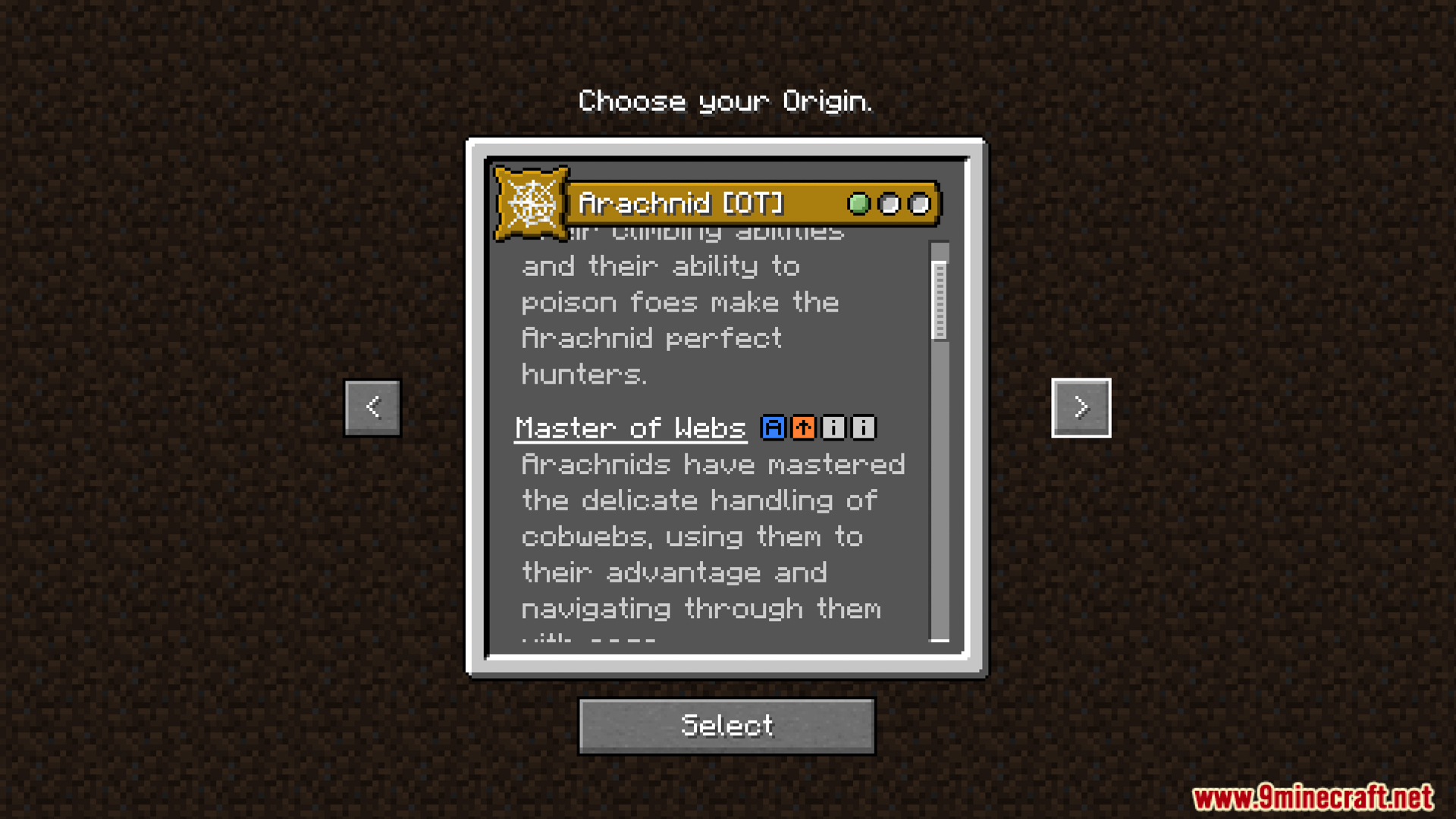 - Arachnid: Arachnid has the Webshot ability, which allows him to shoot webs to pull himself to blocks or mobs. Arachnid’s melee attacks can inflict poison with a certain probability. When climbing walls, his mining speed is not slowed down as usual. When crouching, Arachnid can squeeze through gaps one block high. Arachnid only takes fall damage if he falls from a height greater than sixteen blocks. Arachnid can also convert thread into silk by using nine threads to convert into one block of silk.