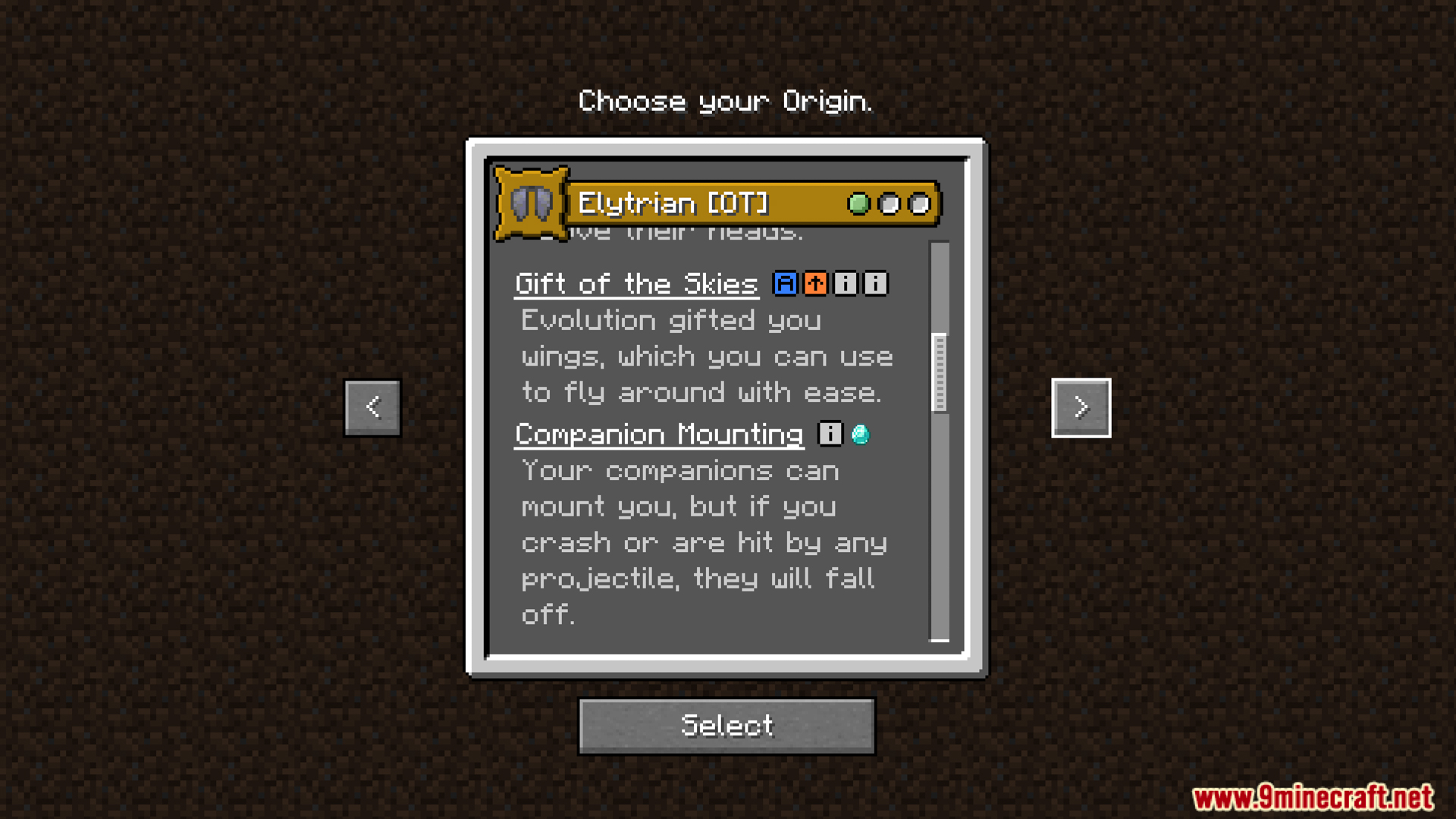 - Elytrian: Elytrian has many different elytra visual styles for players to choose from. Elytrian has the ability to launch from the ground or climb high when flying, but this costs stamina. When wearing heavy armor, the stamina cost to fly or climb is higher. When hovering, damage from long-range attacks is greatly increased. Elytrian has the ability to let other players sit on it and fly with it, if they fly or are attacked, the person sitting on it can fall off.