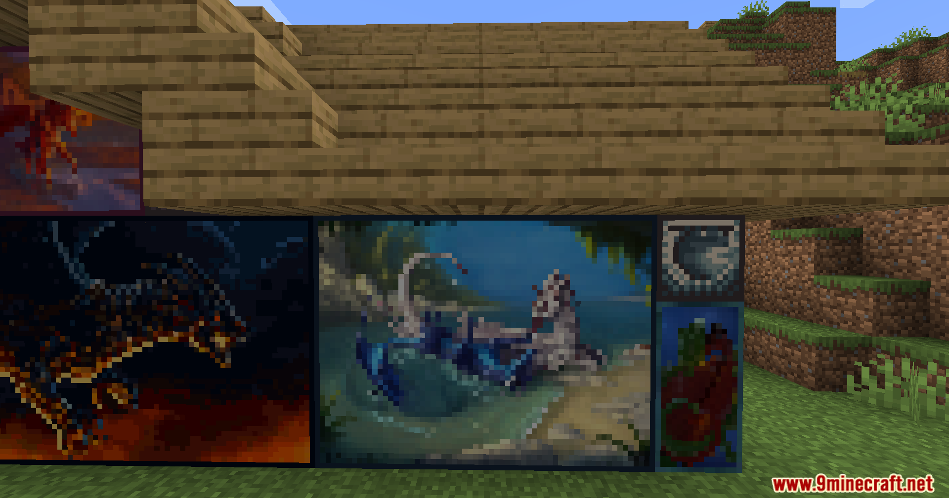 Paintings With Dragons Mod (1.21.1, 1.20.1) adds more than 30 pixelized dragon-themed artworks to Minecraft’s painting pool. Each painting can appear randomly when placing a frame, with sizes ranging from 1×2 to 8×4.