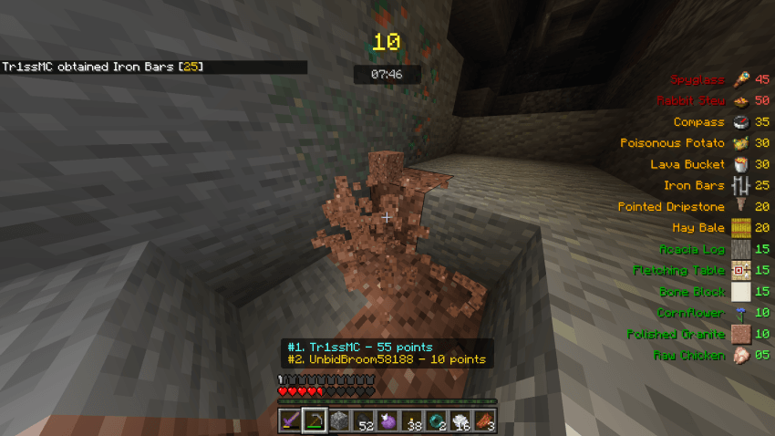 Panorama Item Rush Map (1.21, 1.20) requires collecting rare items to earn points within 10 minutes. The player with the highest score wins. The system generates 430 trillion different item lists, and their locations appear randomly up to 30,000 blocks from the center. Players can choose to explore caves or search the upper areas. Content includes changing starting equipment and unlocking new items through general quests.