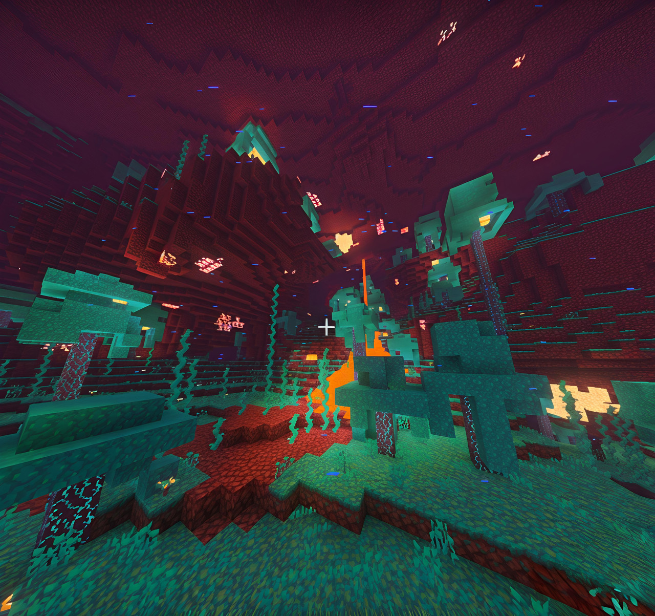 Pasta Shader (v26, 1.21) alters images by adding color and smooth lighting effects. Surfaces like water have added reflections. This creates a cartoon-style look through visual effects.
