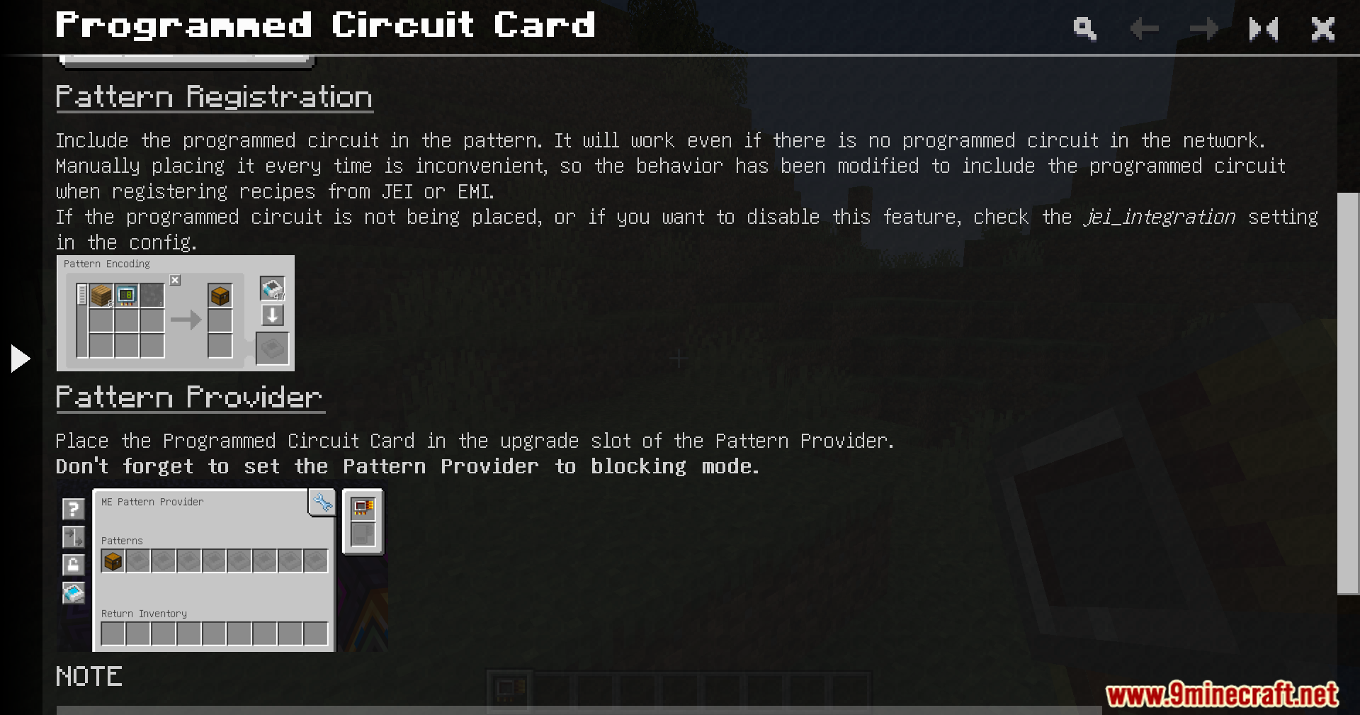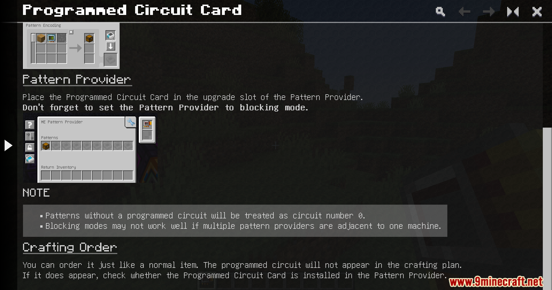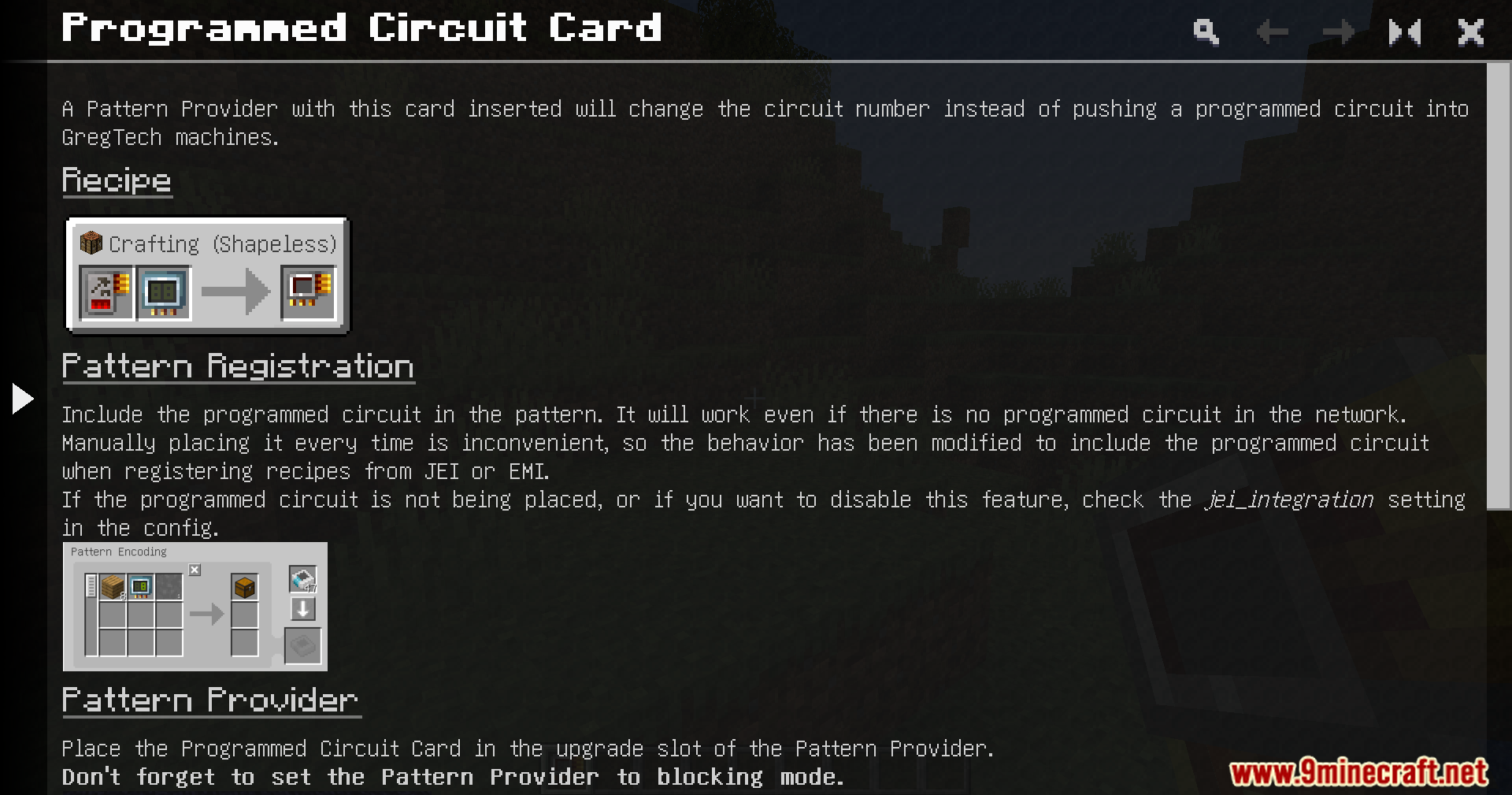 Programmed Circuit Card Mod (1.20.1, 1.20) introduces a dedicated item that stores the required machine number for a recipe. The Programmed Circuit Card is inserted directly into the Pattern Provider. When a recipe that needs a Programmed Circuit is processed, the card supplies the correct circuit configuration automatically.