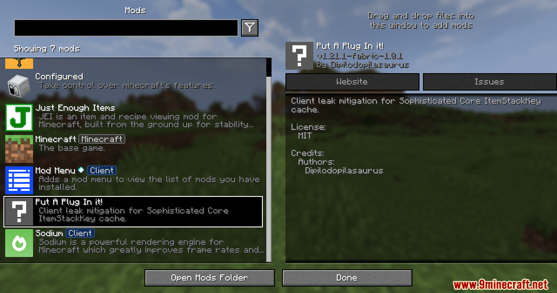 Put A Plug In It Mod focused on fixing memory leak issues, optimizing memory usage and improving compatibility between various memory-related mods. It aims to function as an all-in-one solution by integrating or adapting features from other memory leak and optimization mods while extending version and loader support.