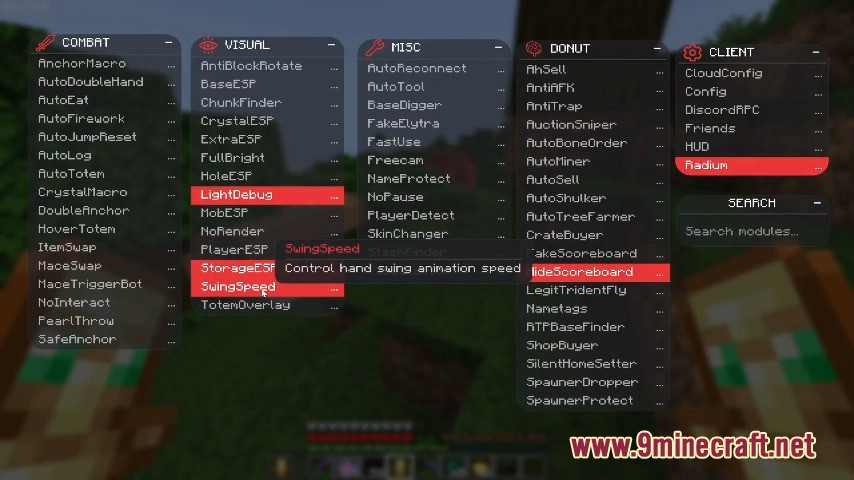 Radium Client Mod (1.21.1) is a powerful utility and combat client for Minecraft, designed for advanced PvP, automation, and exploration. It is especially effective on DonutSMP and anarchy/semi-anarchy servers, allowing players to farm, manage bases, and control server interactions efficiently.