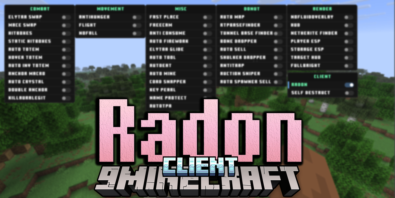Radon Client Mod (1.21.11) is a hybrid PvP and SMP utility client for Minecraft. It helps players with Crystal and Anchor PvP while also providing useful tools for Donut SMP, such as auto sell, base finding, and totem automation. This client is designed to make fighting and survival easier, faster, and more efficient for both new and experienced players.