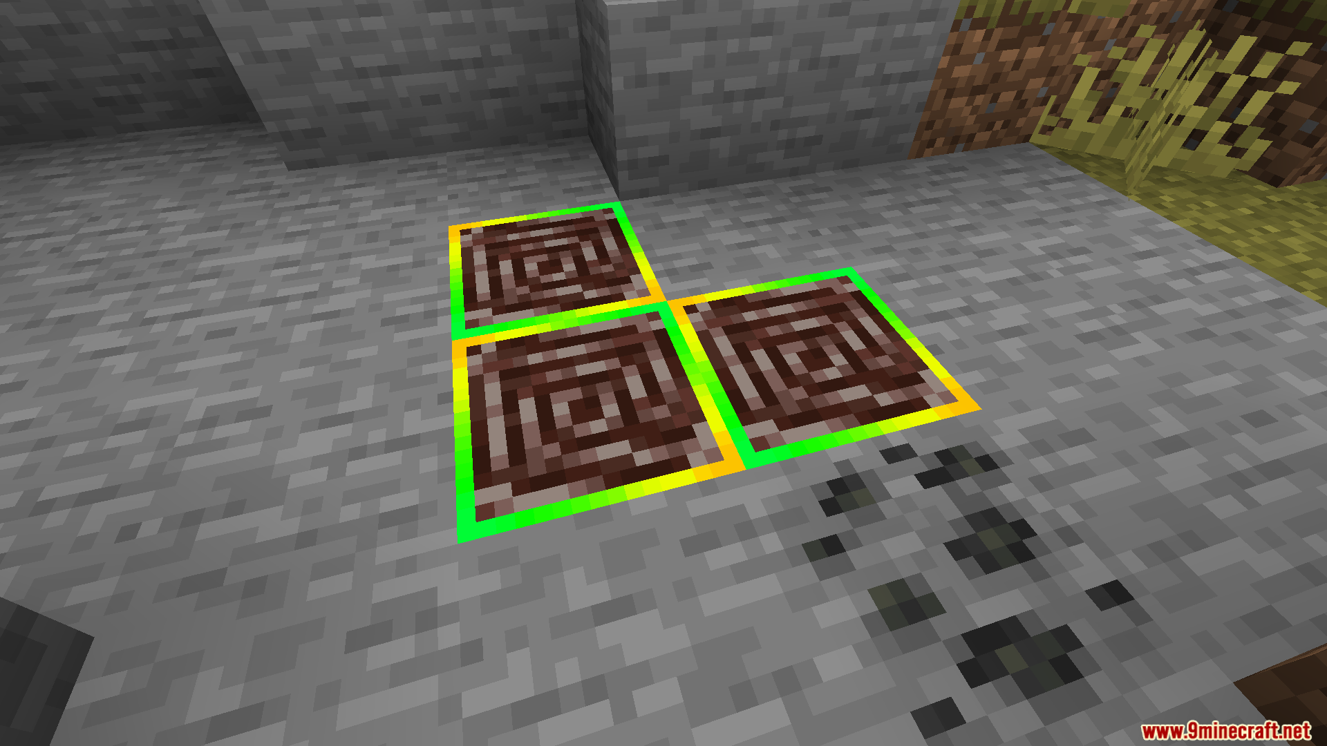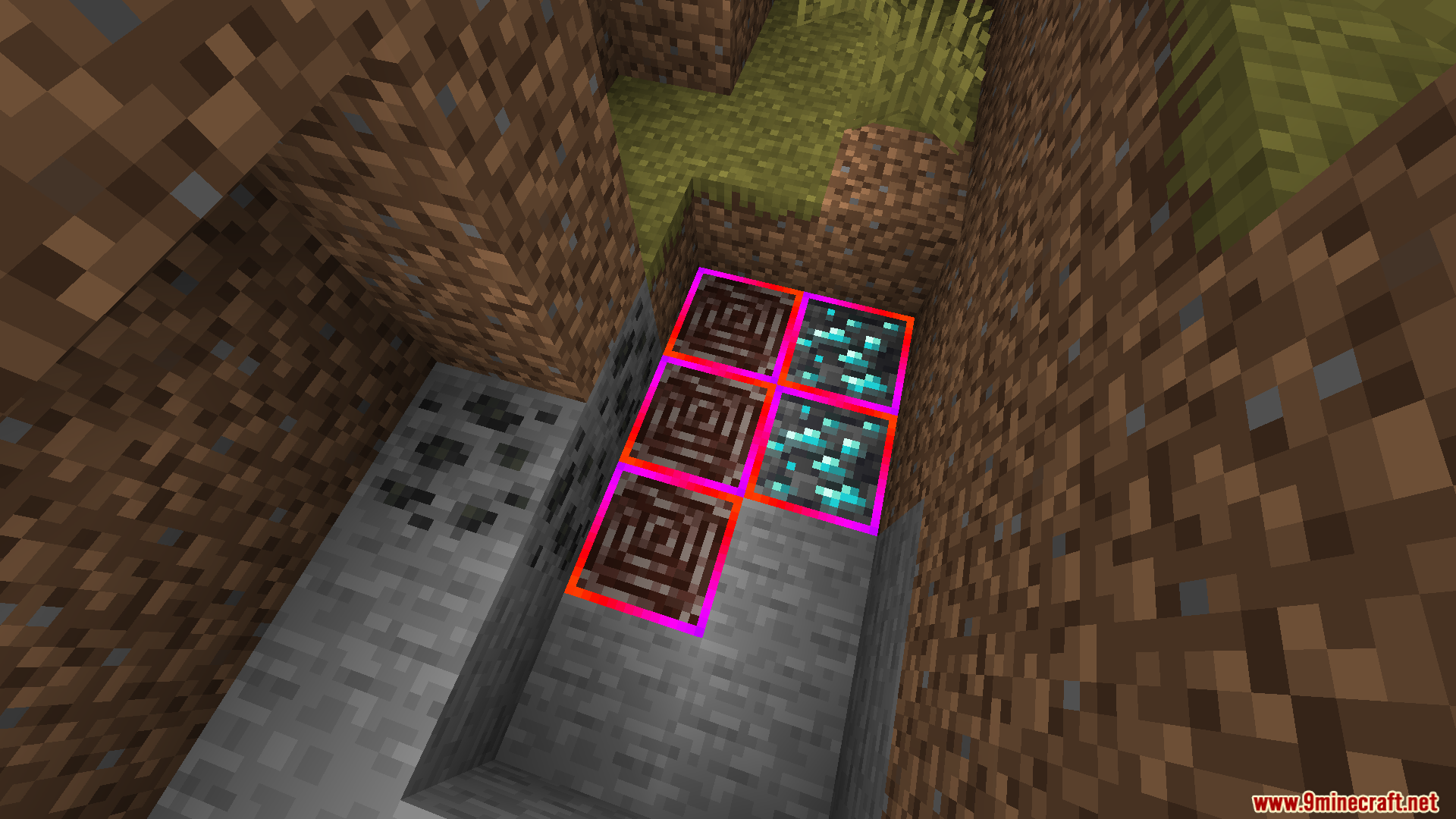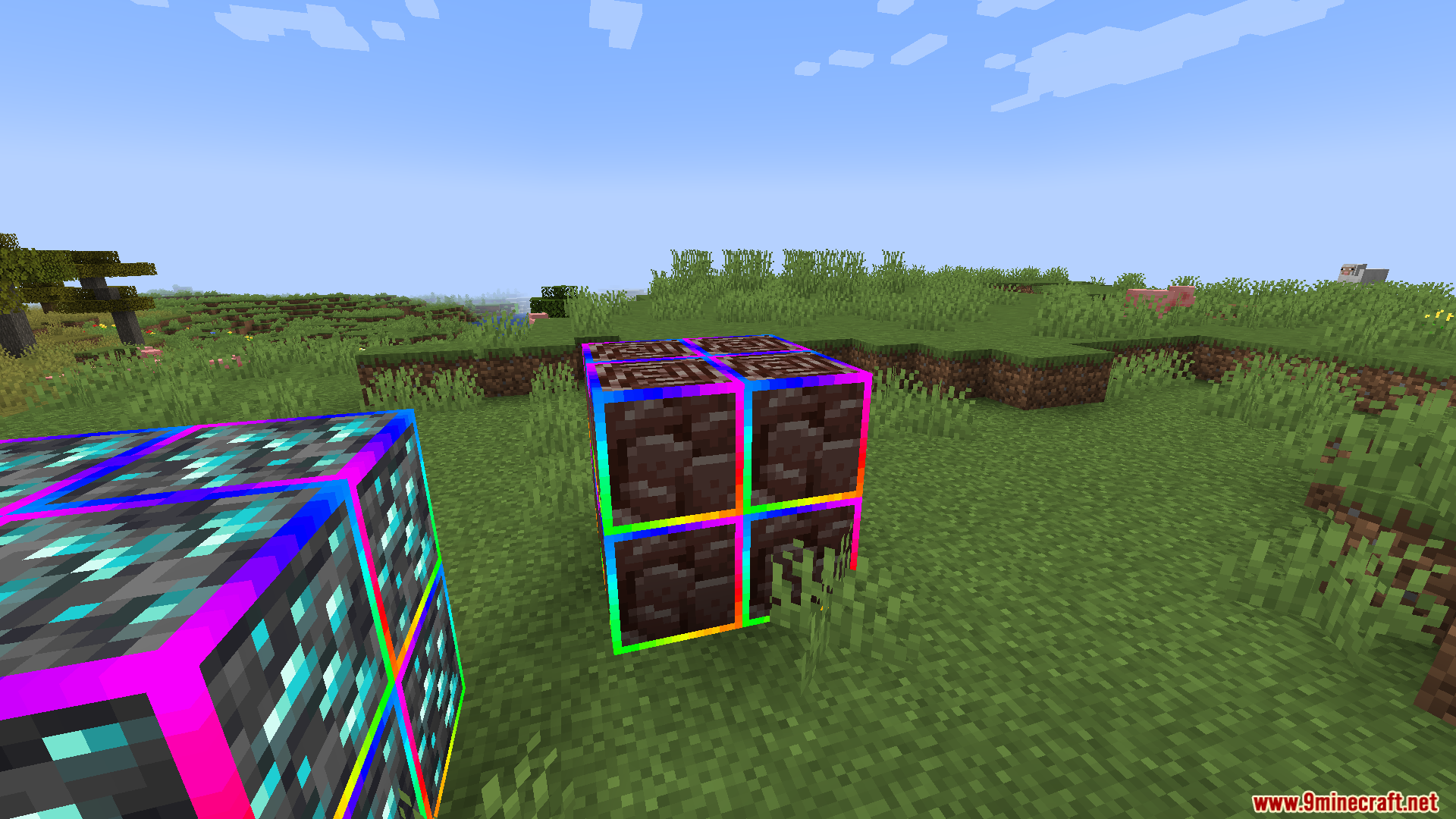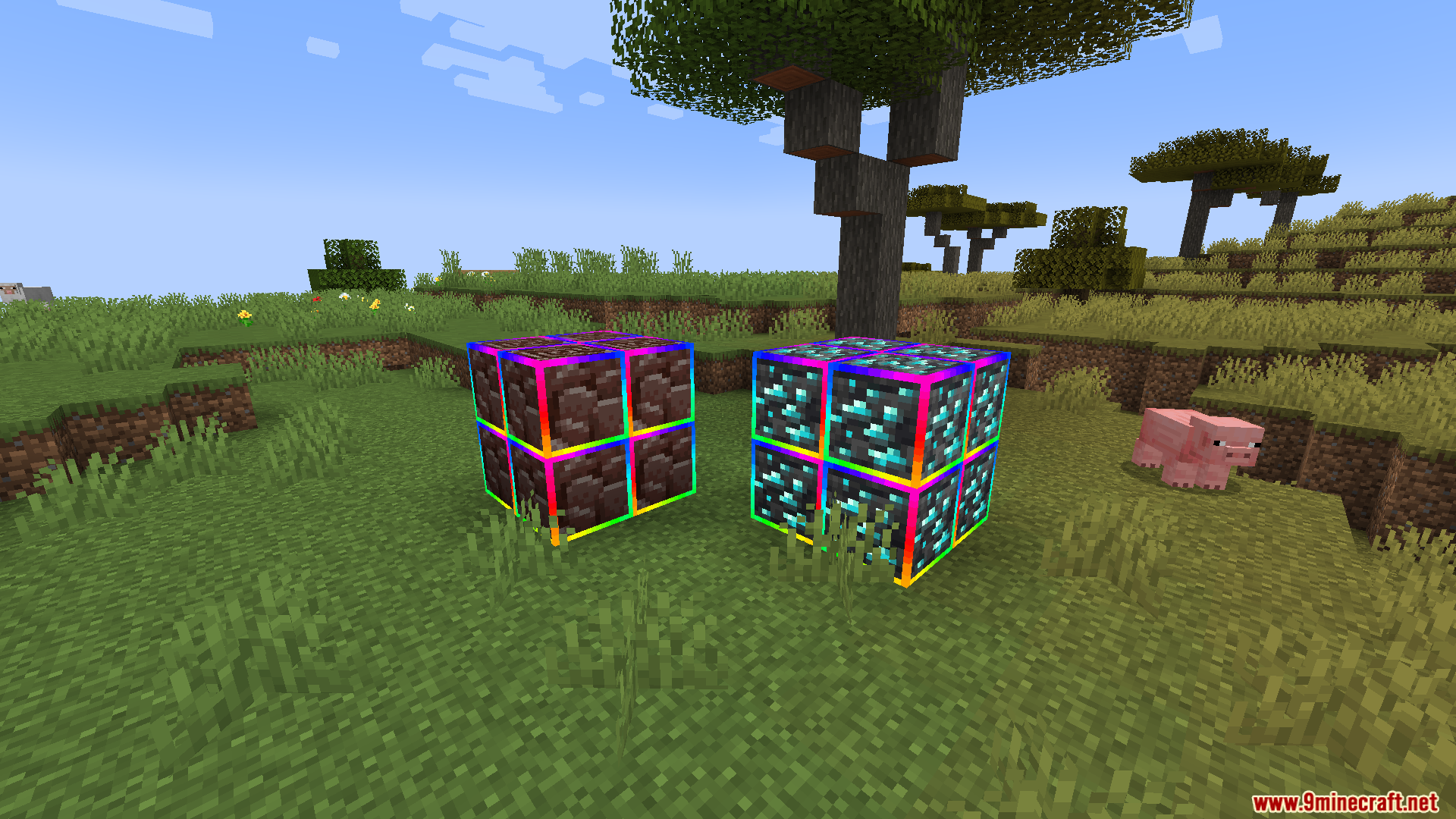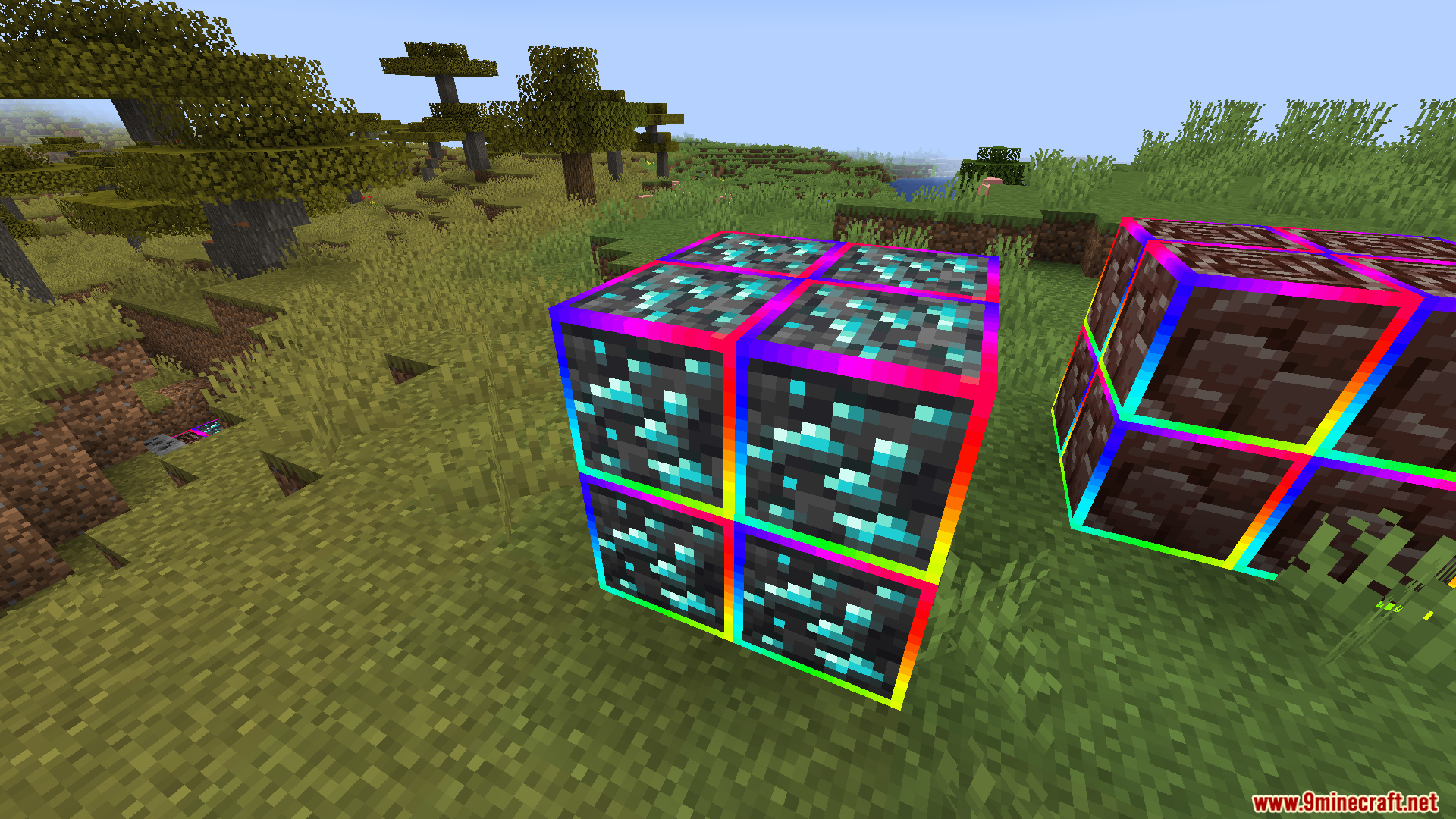 Rainbow Diamond Ores & Ancient Debris Resource Pack (1.21.11, 1.20.1) adds a glowing rainbow outline around both diamond ores and ancient debris, making them much easier to see in caves or the Nether.
