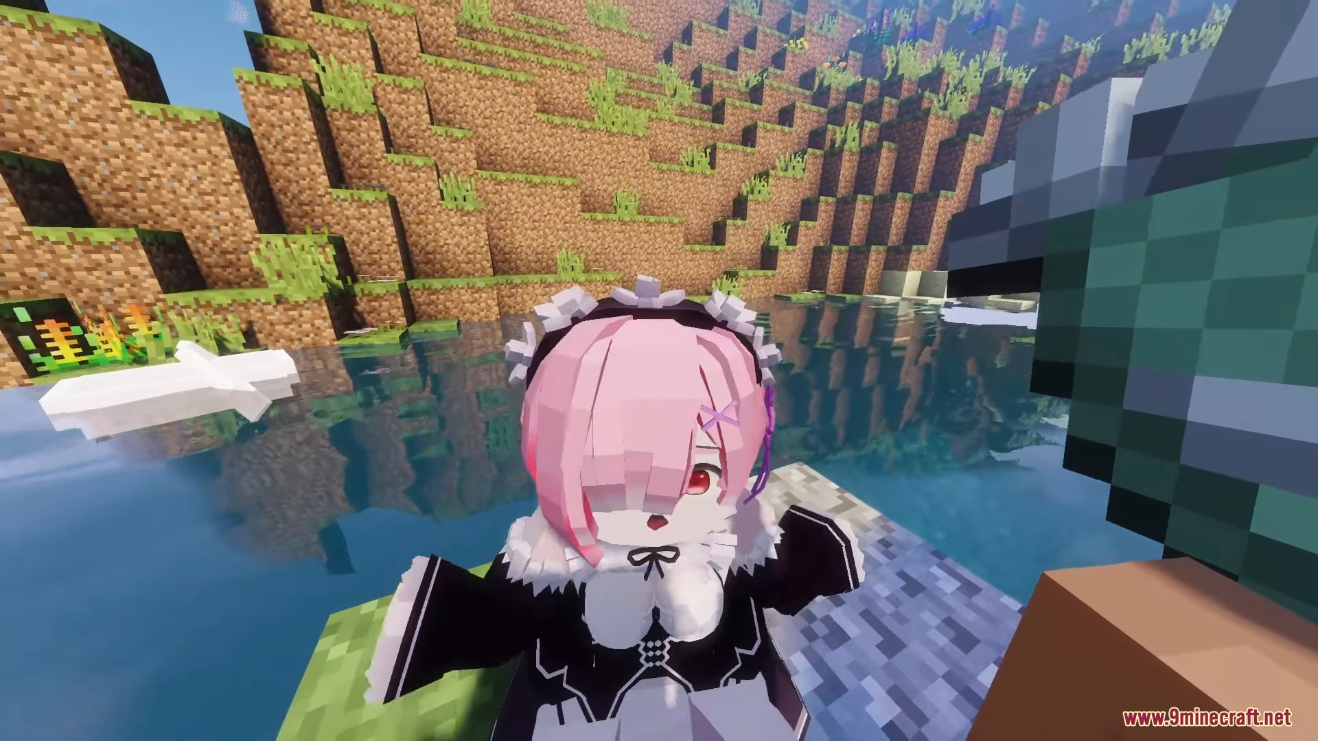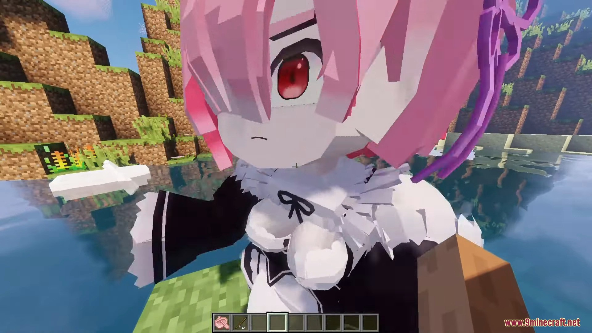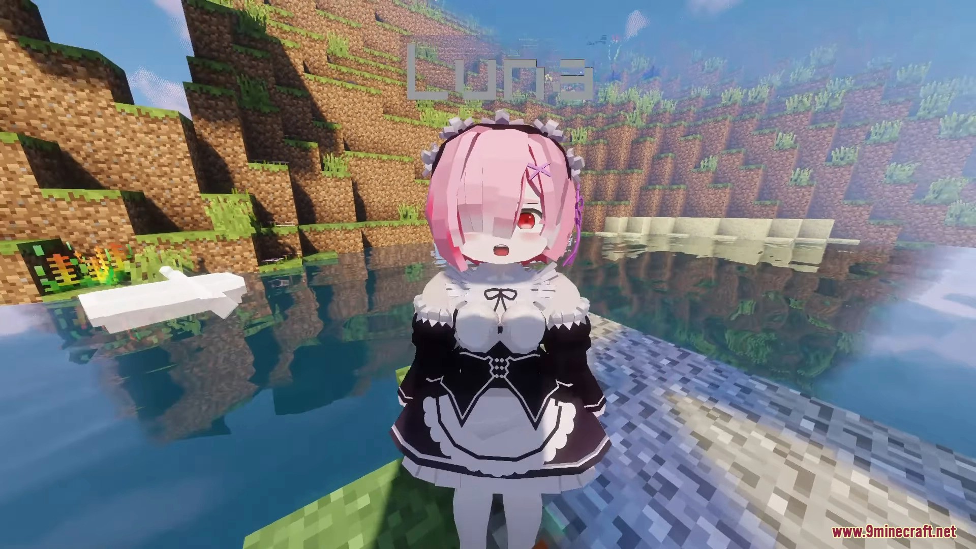 Ram Momo is a character model designed to replace Momo in the PleasureCraft Mod, featuring a distinctive and easily recognizable anime chibi style. Inspired by a fantasy maid design, the model has a signature pink bob haircut that covers one eye, striking red eyes, and delicate hair accessories.