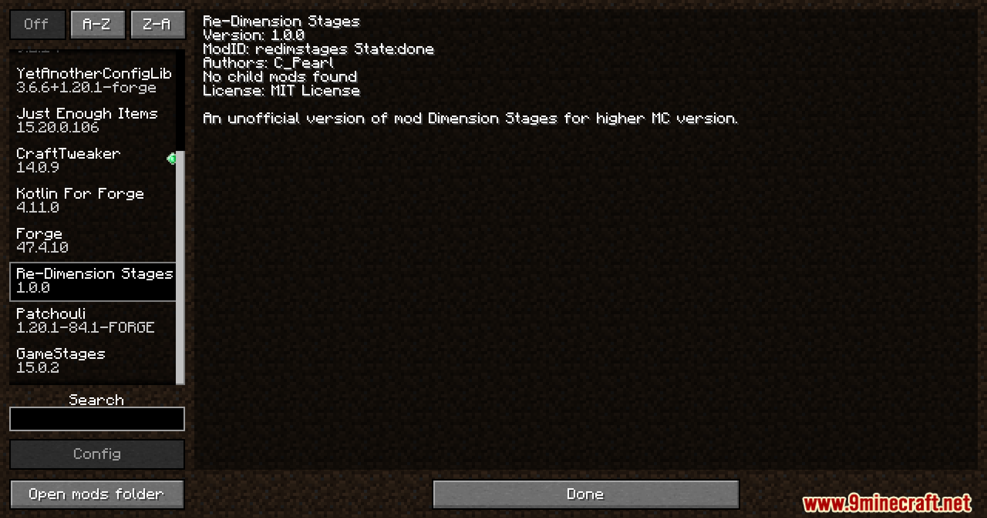 Re-Dimension Stages Mod (1.20.1, 1.20) is an unofficial higher-version continuation of Dimension Stages that restricts dimension access based on Game Stages. Configuration is handled through CraftTweaker scripts, allowing stage requirements to be assigned per dimension and optional custom messages to be shown when a player is denied entry.