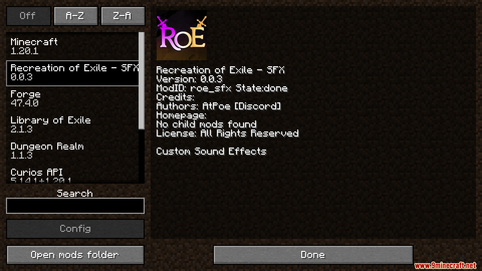 Recreation of Exile SFX Mod (1.20.1, 1.20) adds 100+ custom sound effects (SFX) for use with the Mine & Slash mod. The mod doesn’t do anything by itself.