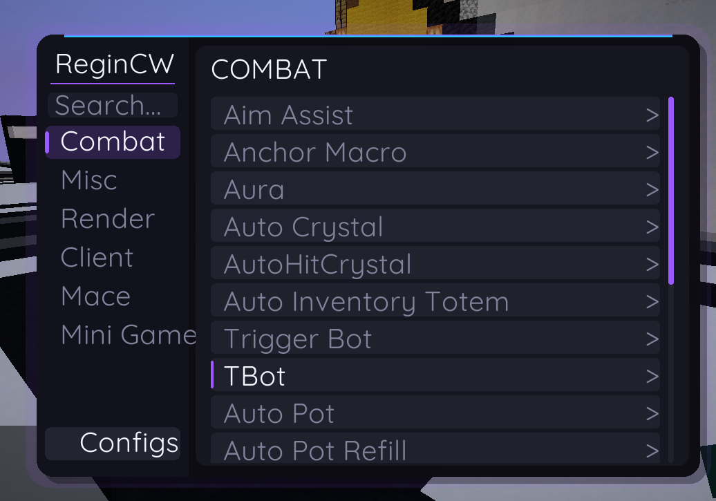 ReginCW Client Mod (1.21.4) is a PvP-focused Minecraft client designed to improve combat performance through automation and combat assistance tools. It is mainly used for Crystal PvP, Anchor PvP, and Potion-based fights.