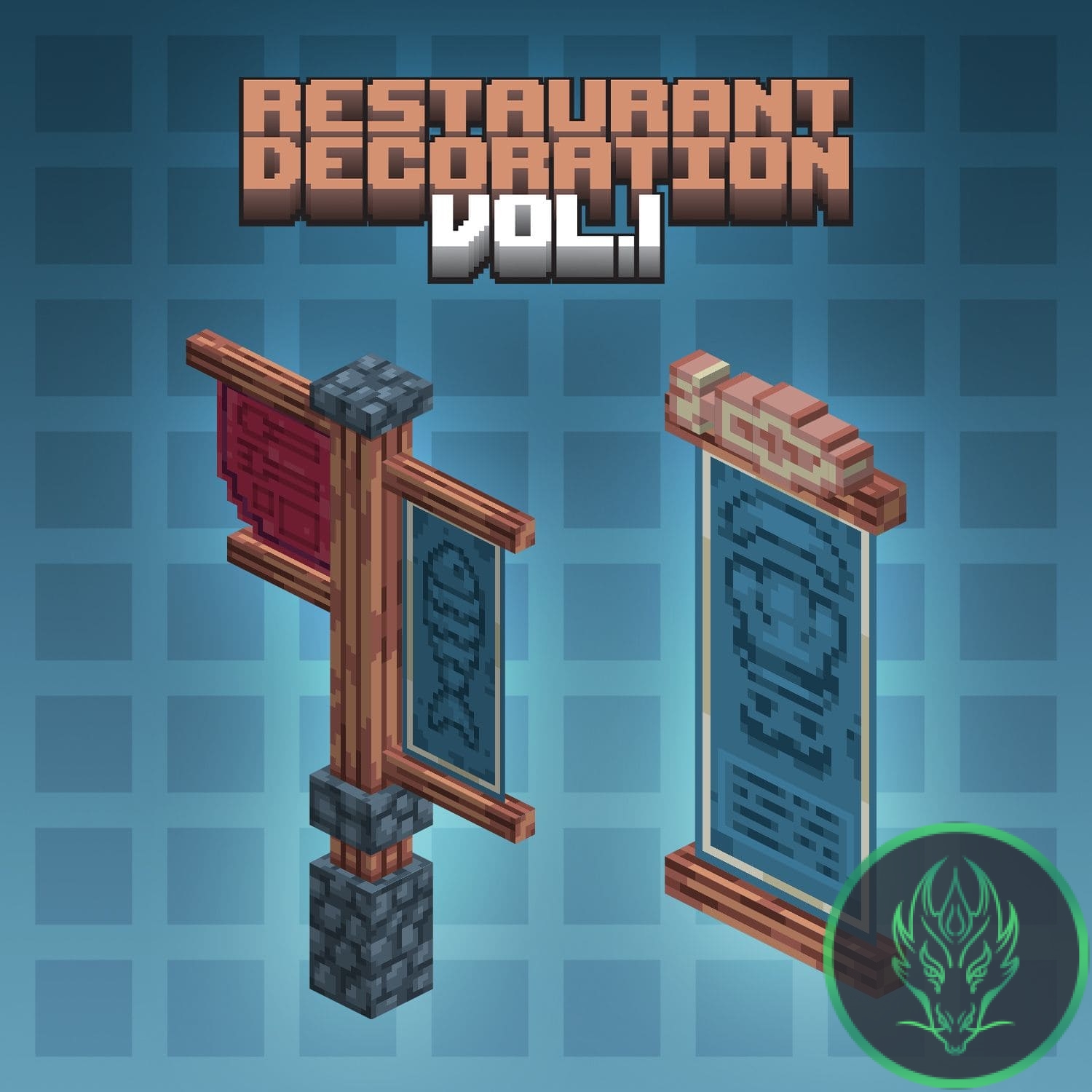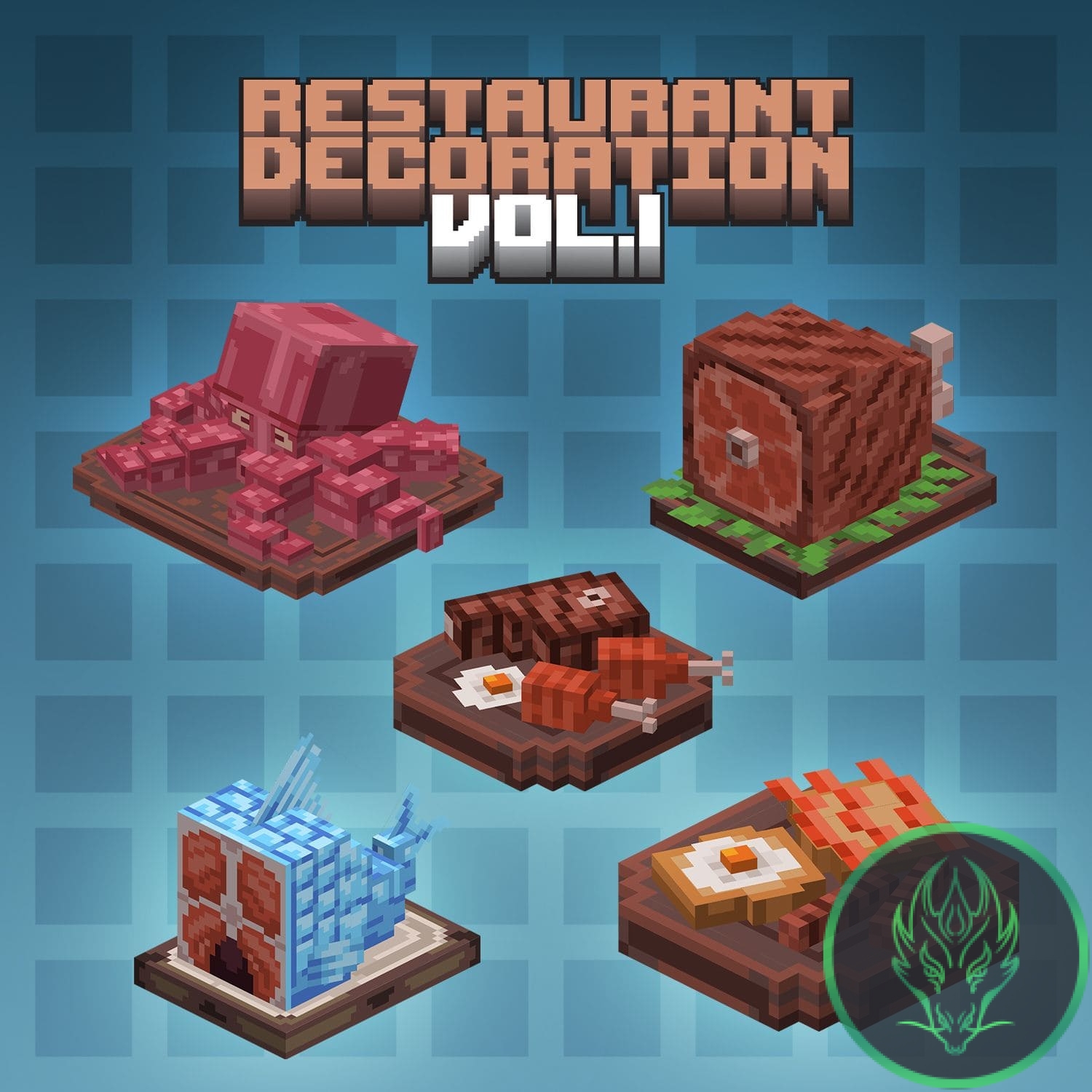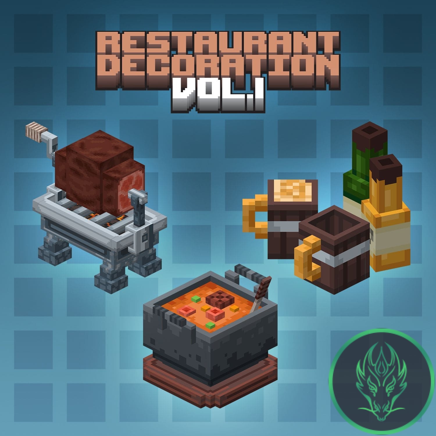 Restaurant Decoration Pack Volume 1 Model is a 3D asset collection featuring around 20 low-poly models of restaurant furniture, food items, and decorative elements for use in games, Minecraft builds, or 3D projects.