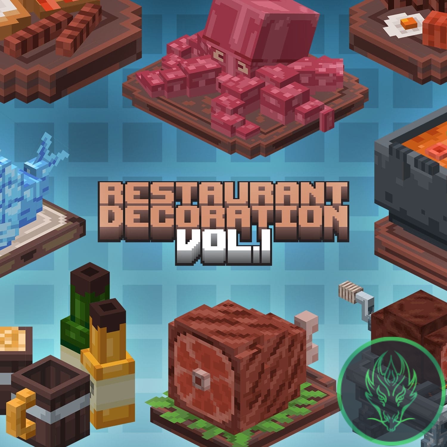 Restaurant Decoration Pack Volume 1 Model is a 3D asset collection featuring around 20 low-poly models of restaurant furniture, food items, and decorative elements for use in games, Minecraft builds, or 3D projects.