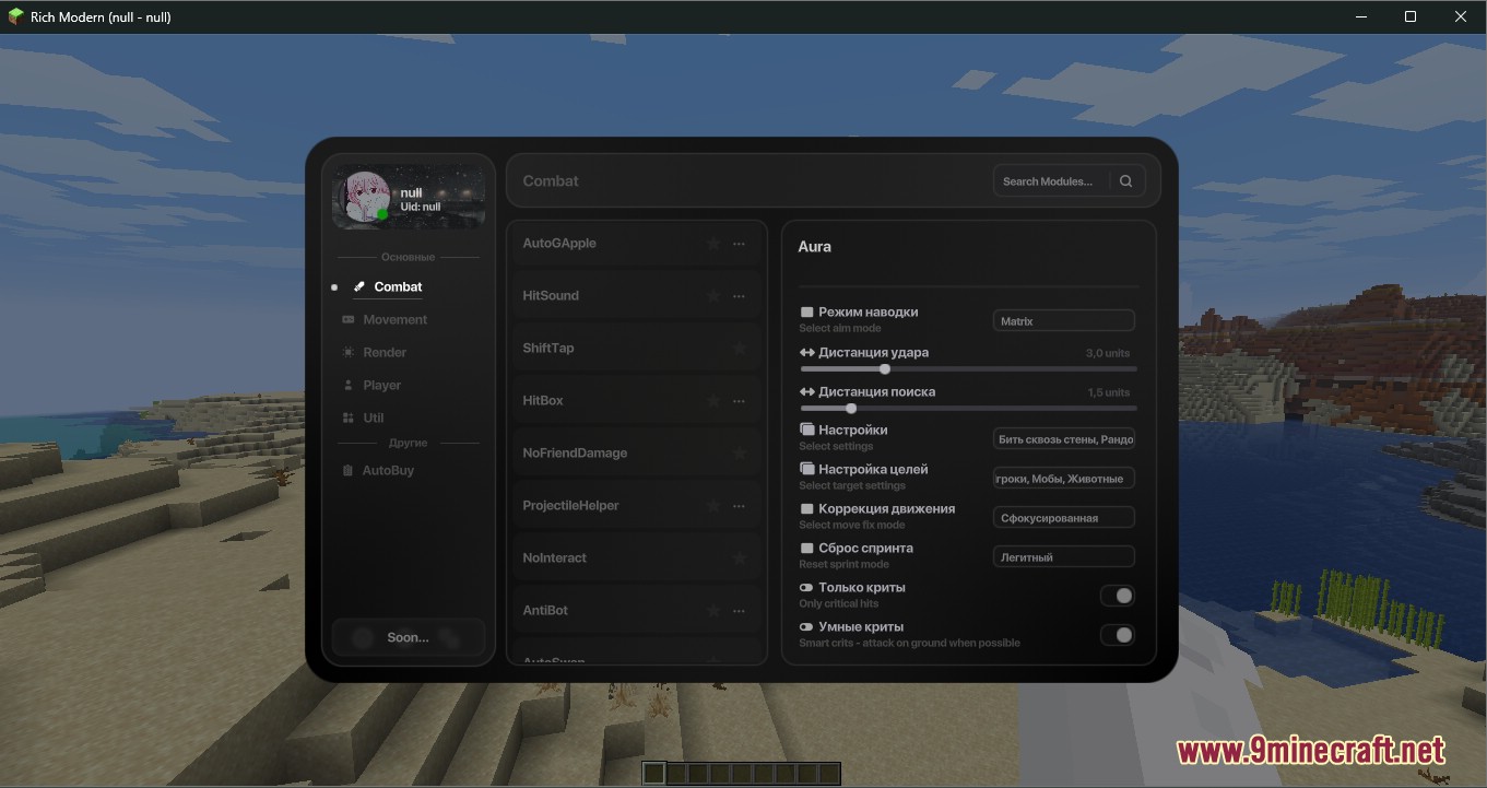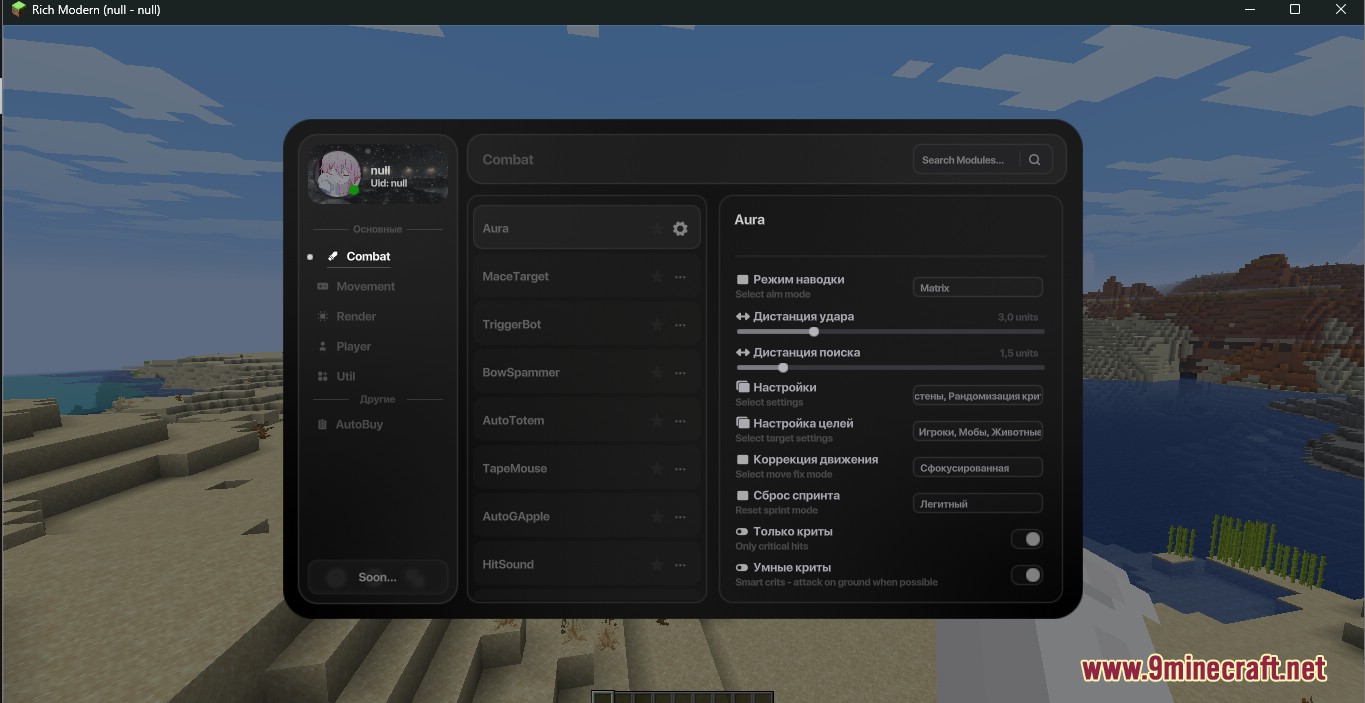 Rich Modern Client Mod (1.21.11) is a client for Minecraft designed to enhance PvP and anarchy-style gameplay. It offers customizable modules focused on combat optimization, automation, movement support, smart combat assistance, survival utilities.