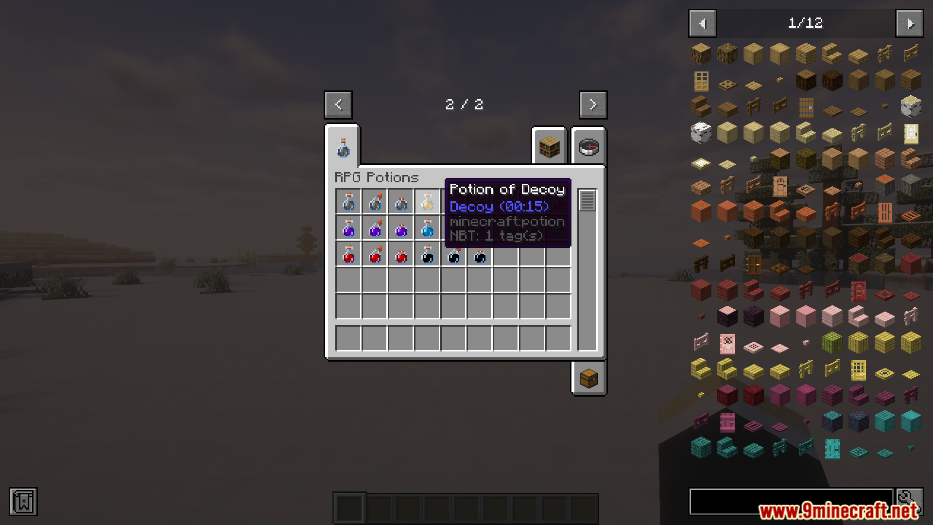 RPG Potions Mod (1.21.1, 1.20.1) introduces 8 new tactical potions designed primarily for PvP combat, but also useful in PvE, raids, and custom maps. These potions add depth by affecting vision, mobility, deception, and battlefield control, making fights more strategic and unpredictable.