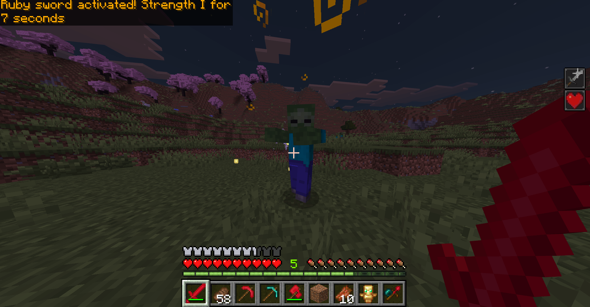 - Ruby Sword: Diamond-grade sword that activates Strength II for 7 seconds after killing a creature (has a cooldown).