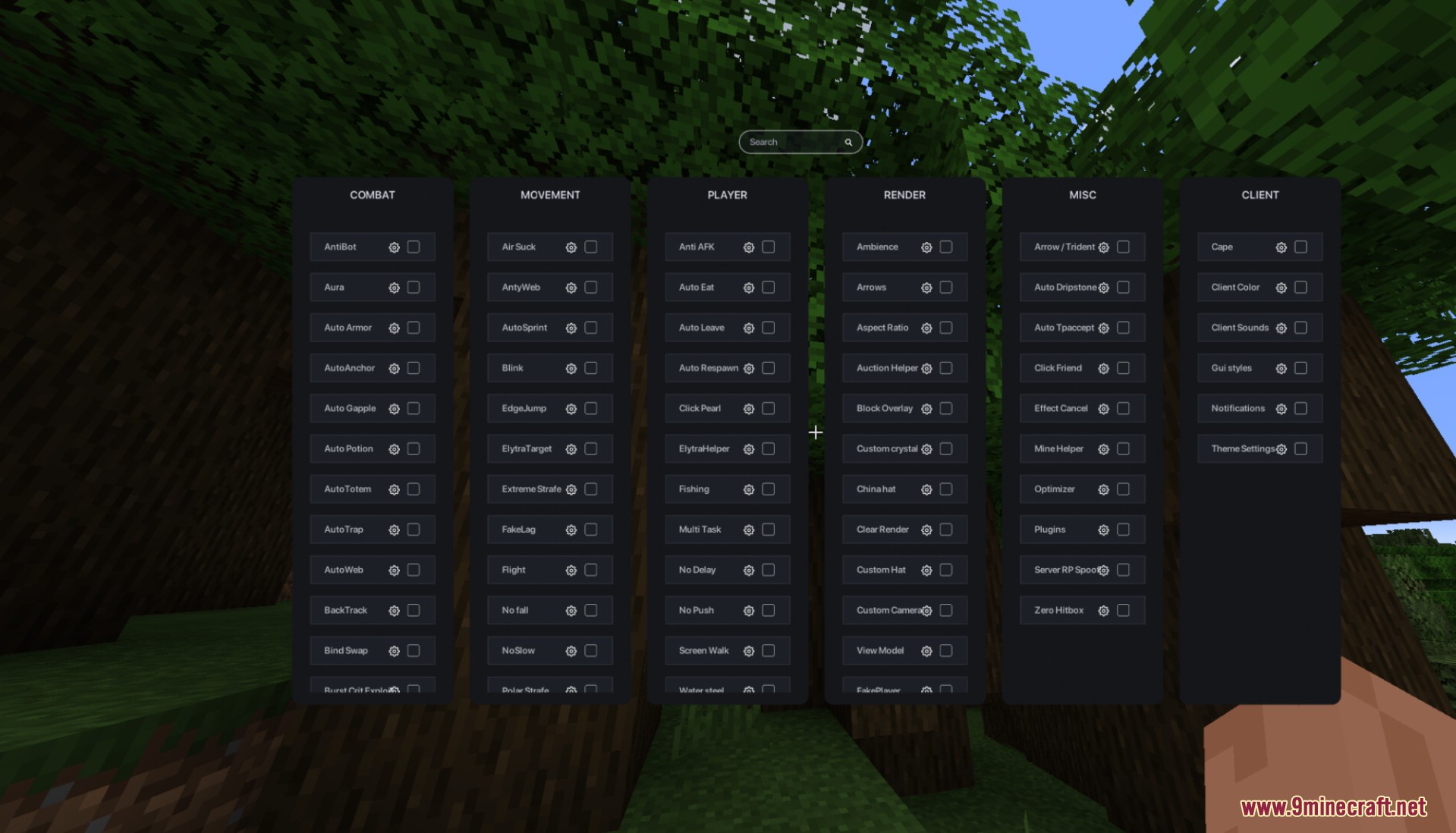 - Player: Anti AFK, Auto Eat, Auto Leave, Auto Respawn, Click Pearl, ElytraHelper, Multi Task, Water Speed.