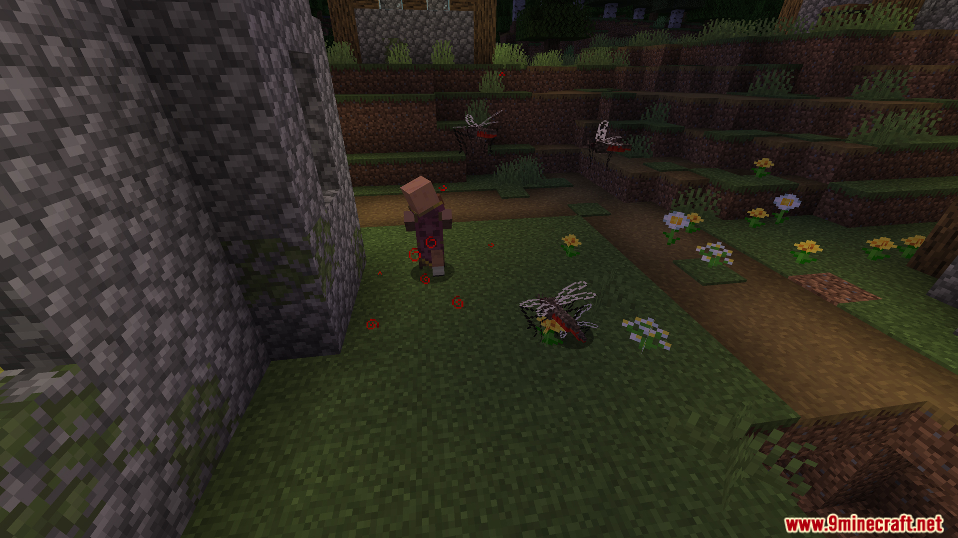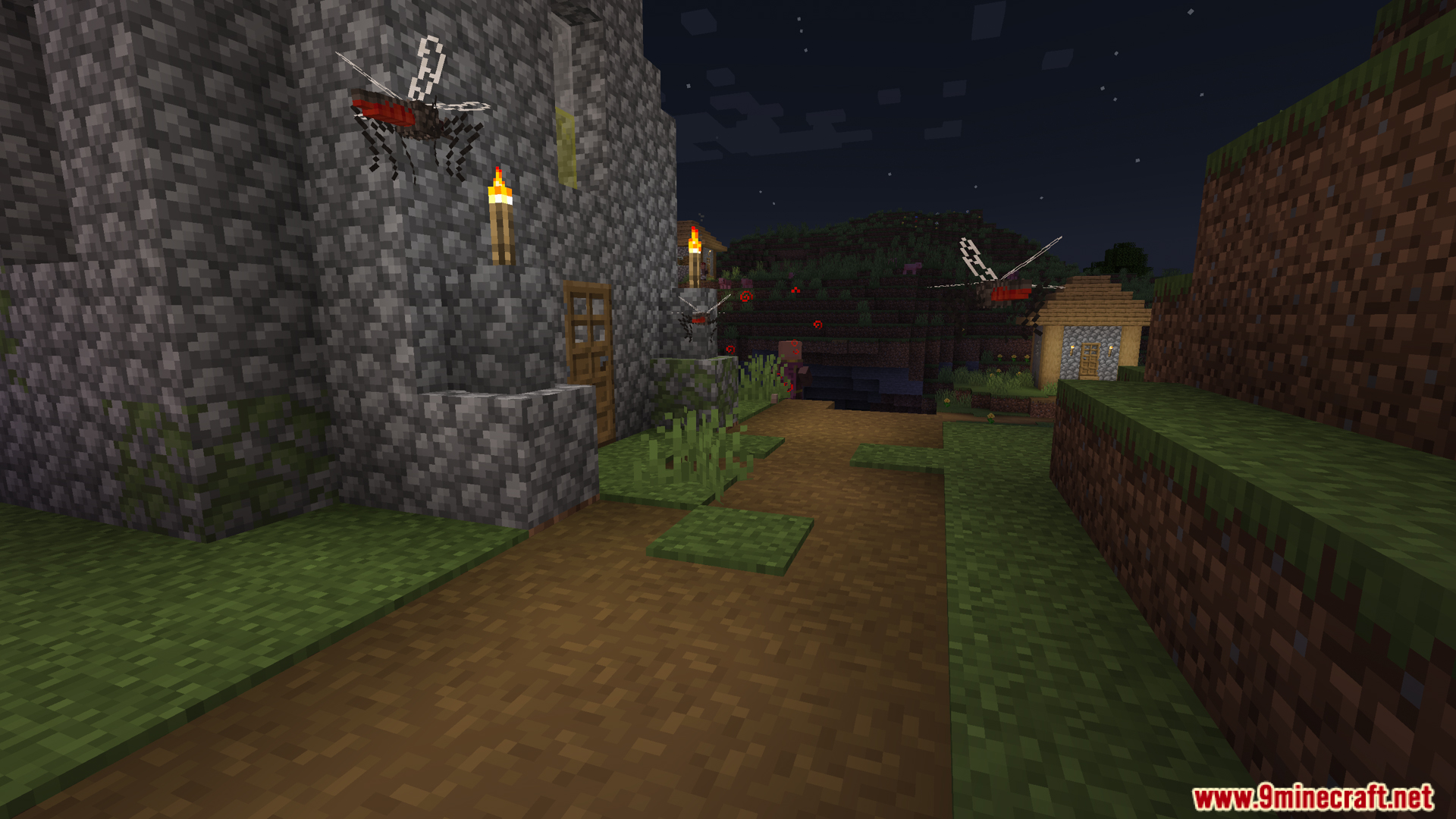 SCP 149 Mod adds small but highly dangerous flying entities from the SCP universe. These tiny creatures appear often in groups and seek out players and villagers as prey. Despite their fragile size, they are extremely dangerous due to their infection ability. When they attack, they can infect their victims with SCP-149-A, causing them to lay Blood Fly eggs.