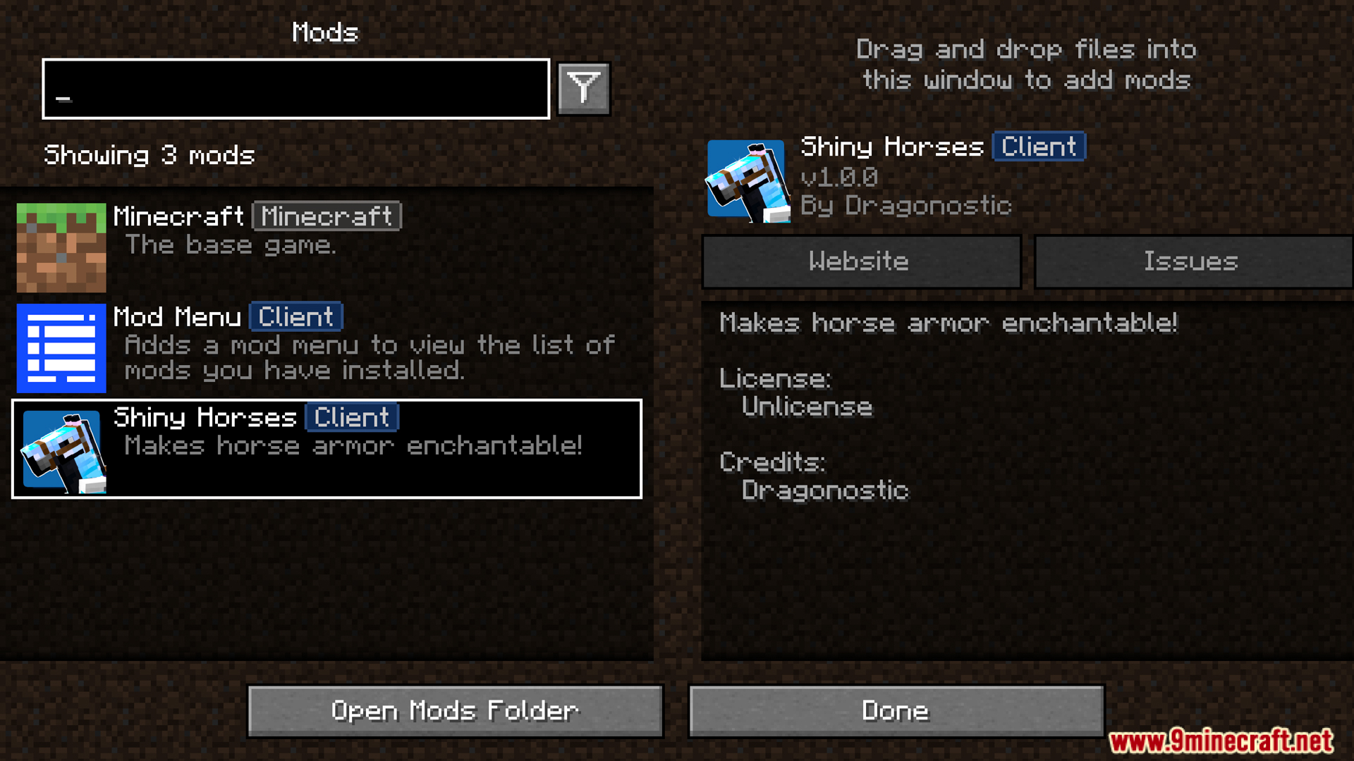 Shiny Horses Mod (1.20.1, 1.19.4) is a mod for Minecraft that allows you to add enchantments to Horse Armor, meaning you can use an Enchantment Table or Anvil to add enchantments to your horse armor, similar to a shirt, to help protect your horse while it travels, fights, or explores the world.