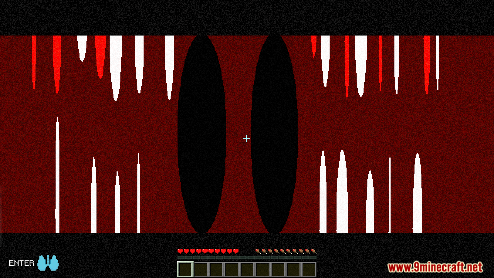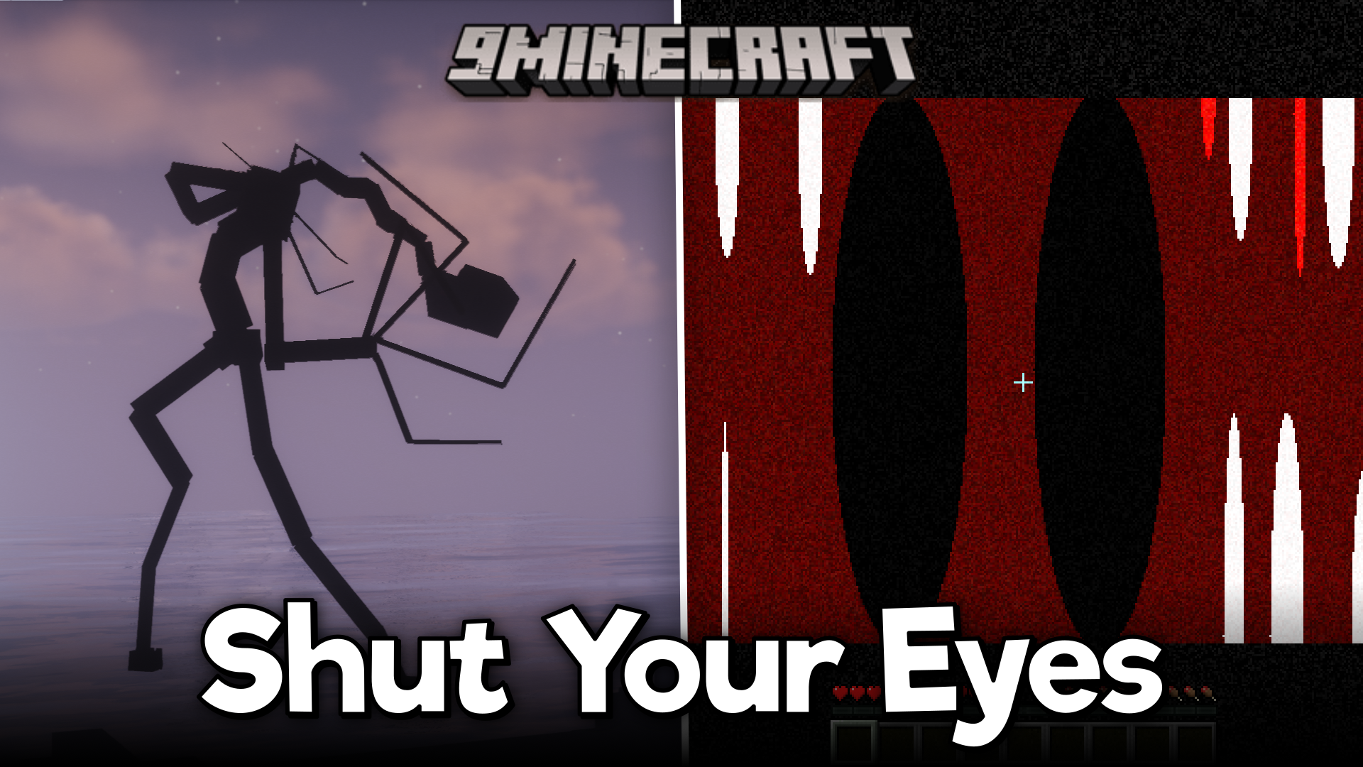 Shut Your Eyes Mod (1.20.1, 1.19.2) introduces a new creature that haunts you throughout your game. The creature appears when you are the most vulnerable and can attack you only if you can see it. This means, you can escape the wrath of the creature simply by closing your eyes and ignoring its existence. As soon as you sense the creature, press the keybind to close your eyes. This keybind is set to G by default, but can be configured in the keybind settings. Also, press the ENTER key to hold your breath. Once the sound cues indicate that the creature is gone, you can open your eyes and breath, and then continue your game.