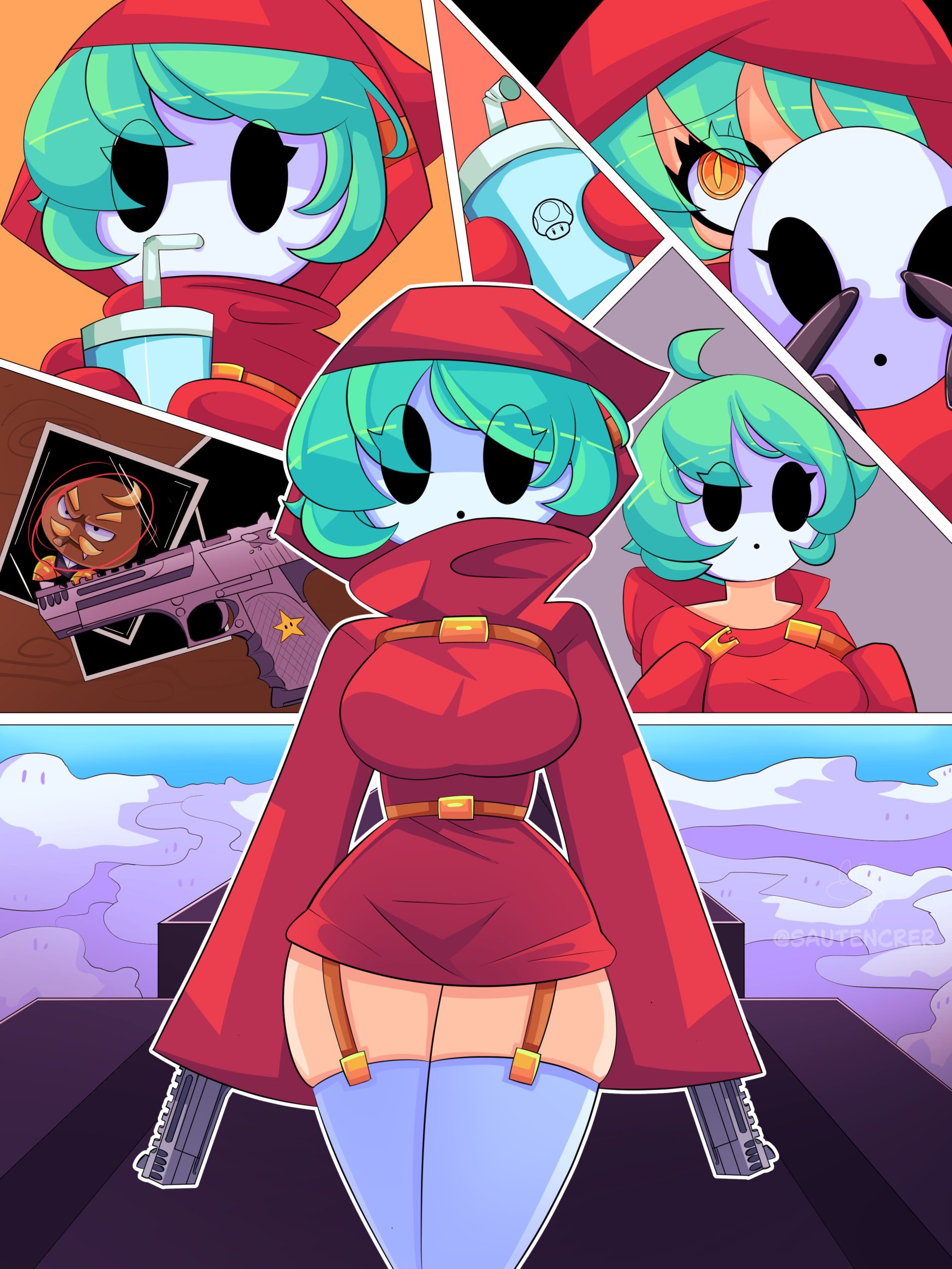 Shygal Ellie Jenny Mod Model is inspired by Shy Guys from the Super Mario series, reimagined as a feminine “Shygal” variant. Shygal Ellie Jenny Mod Model adapts the shy masked minions’ design with teal bob hair peeking from a red hood and mask-face, wide black eyes and blush, a flowing red robe with a gold buckle exposing cleavage and hips, garter belts, and stockings.