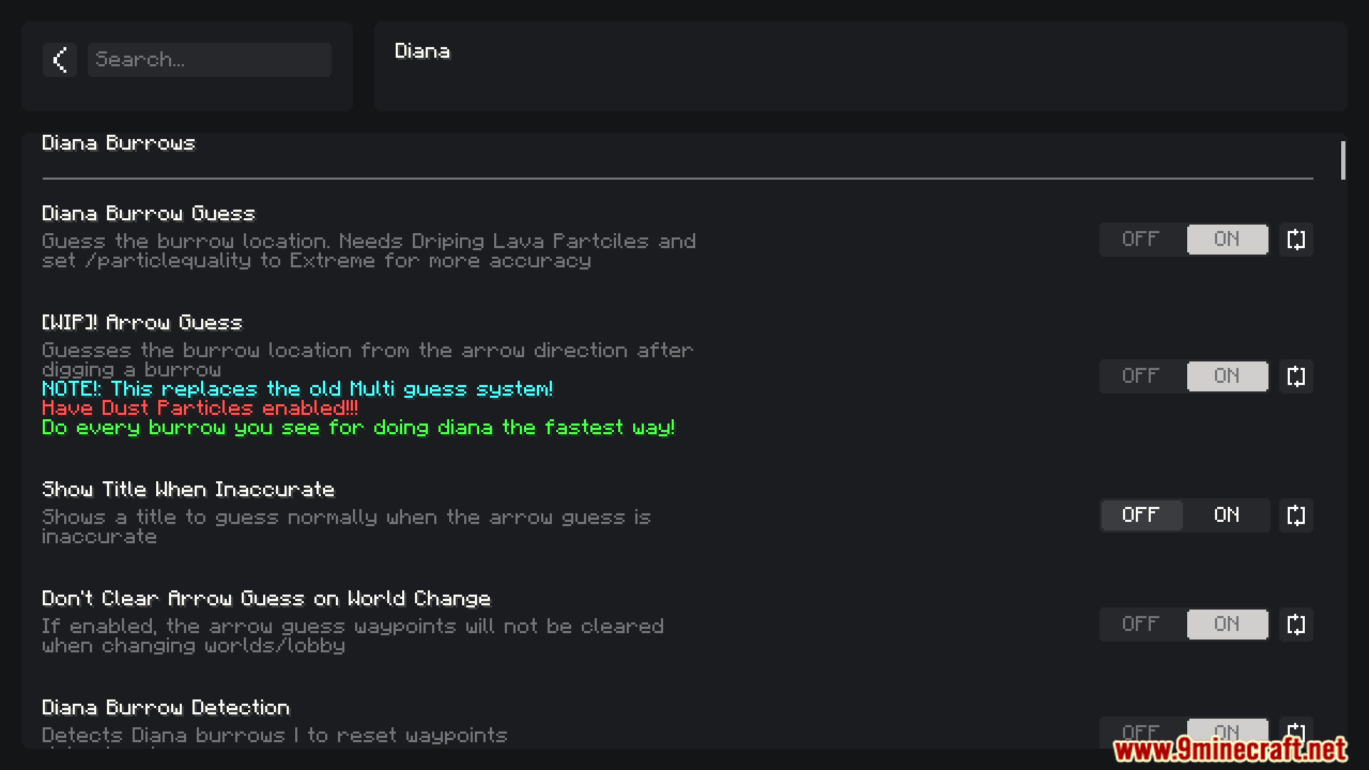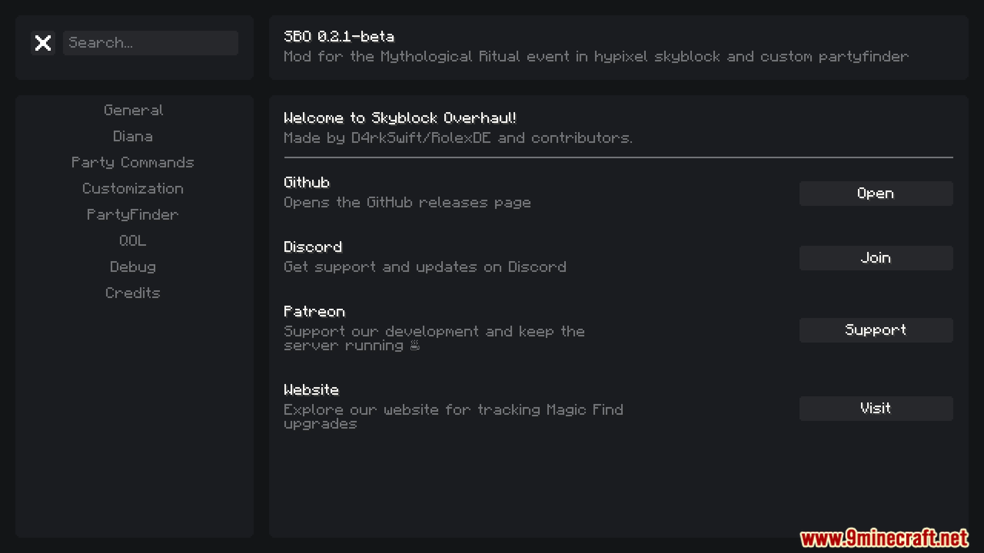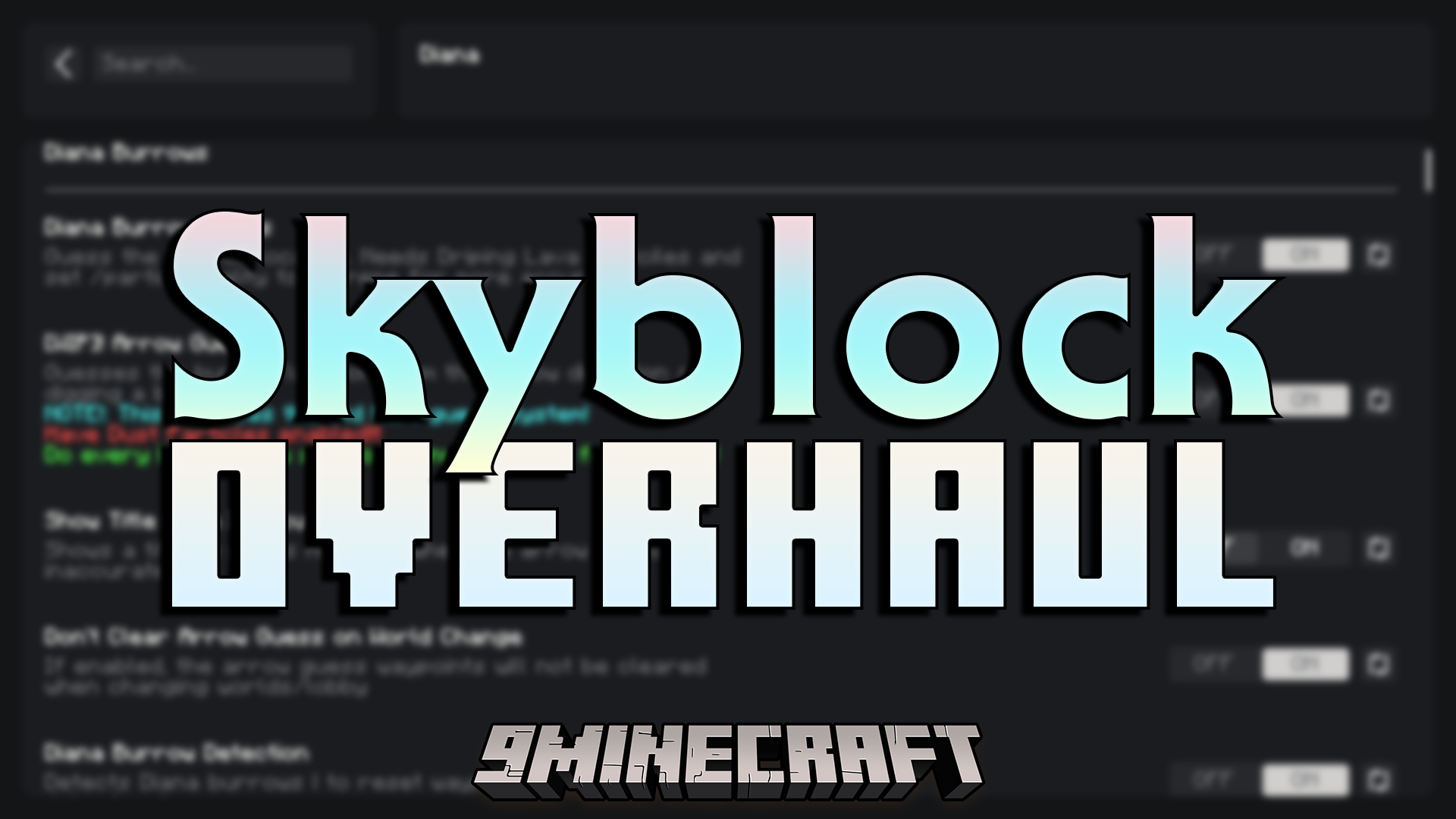 Skyblock Overhaul Mod primarily focused on the Diana event. It adds advanced burrow detection, warp tools, loot trackers, customizable waypoints, and party management features to streamline gameplay during Mythological Rituals.