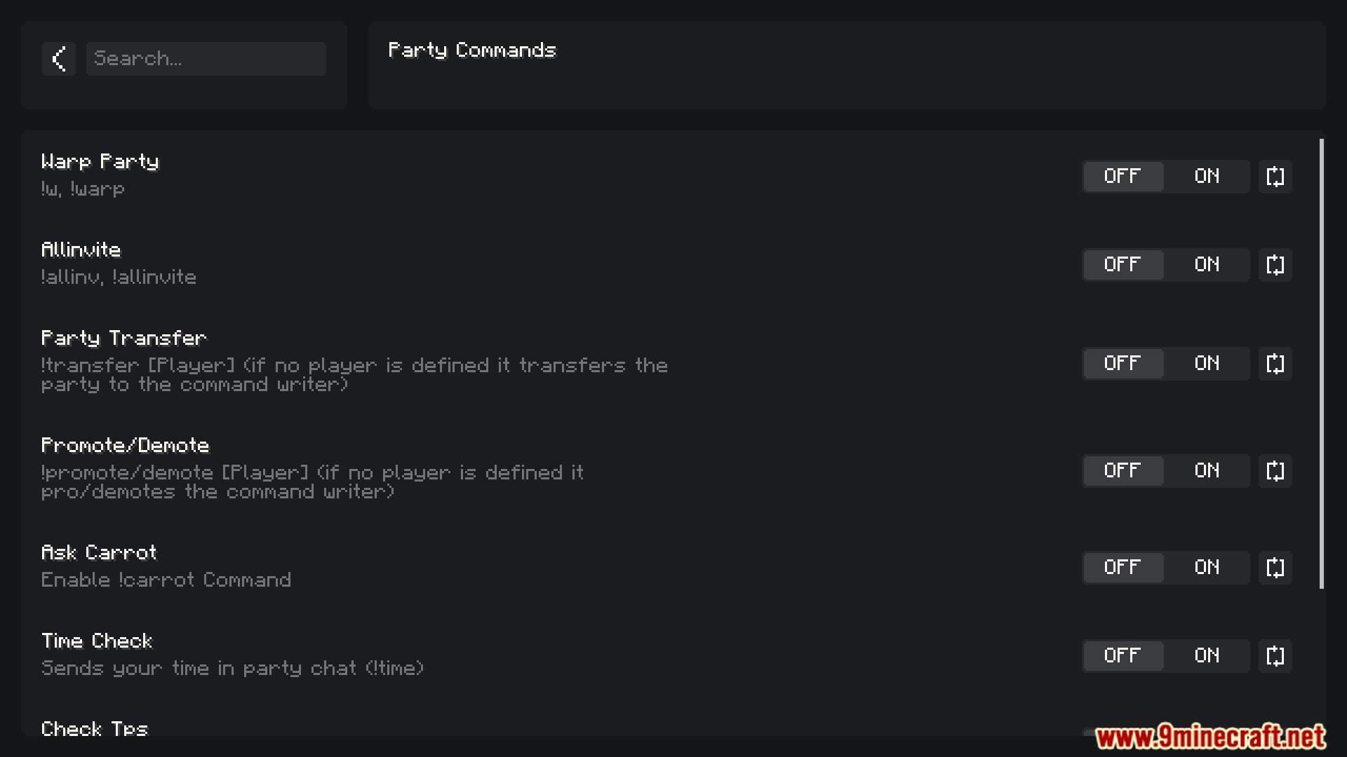 - Party management commands.