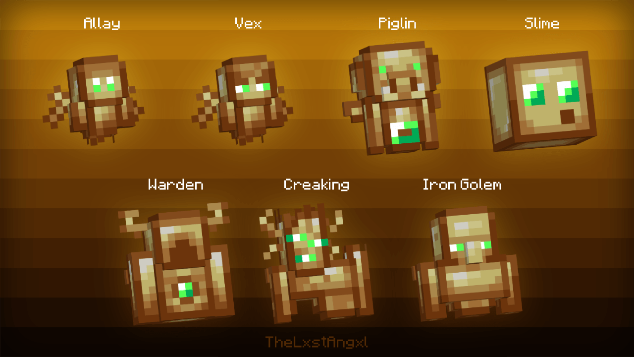 - The list of mobs includes: Villager, Pillager, Witch, Zombie Villager, Zombie, Skeleton, Creeper, Enderman, Allay, Vex, Piglin, Slime, Warden, Creaking, Iron Golem.
