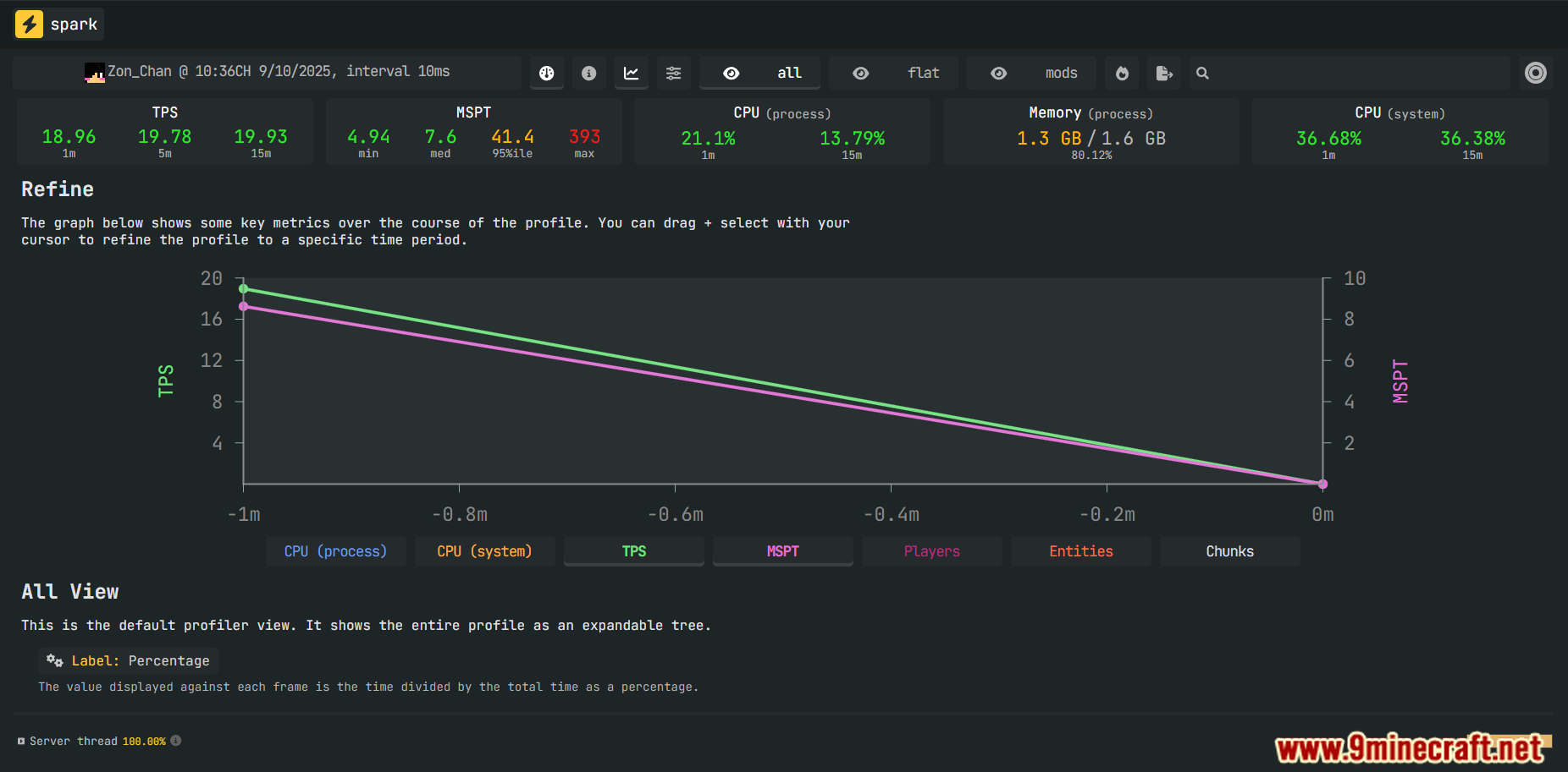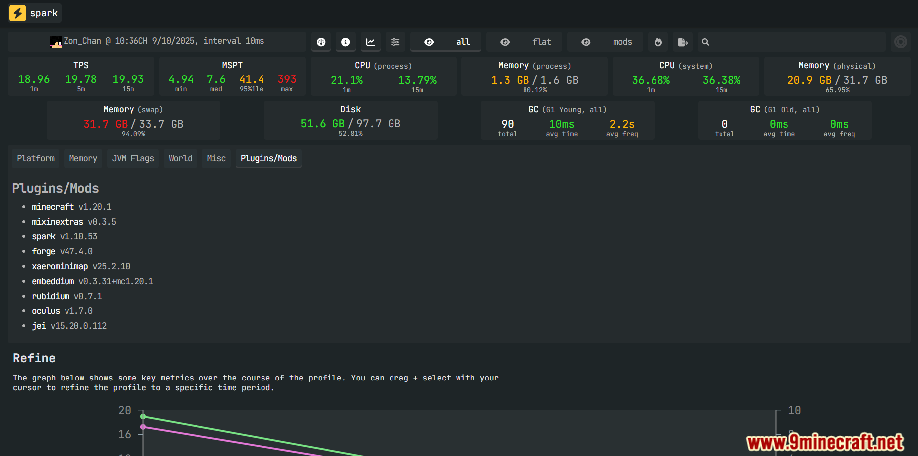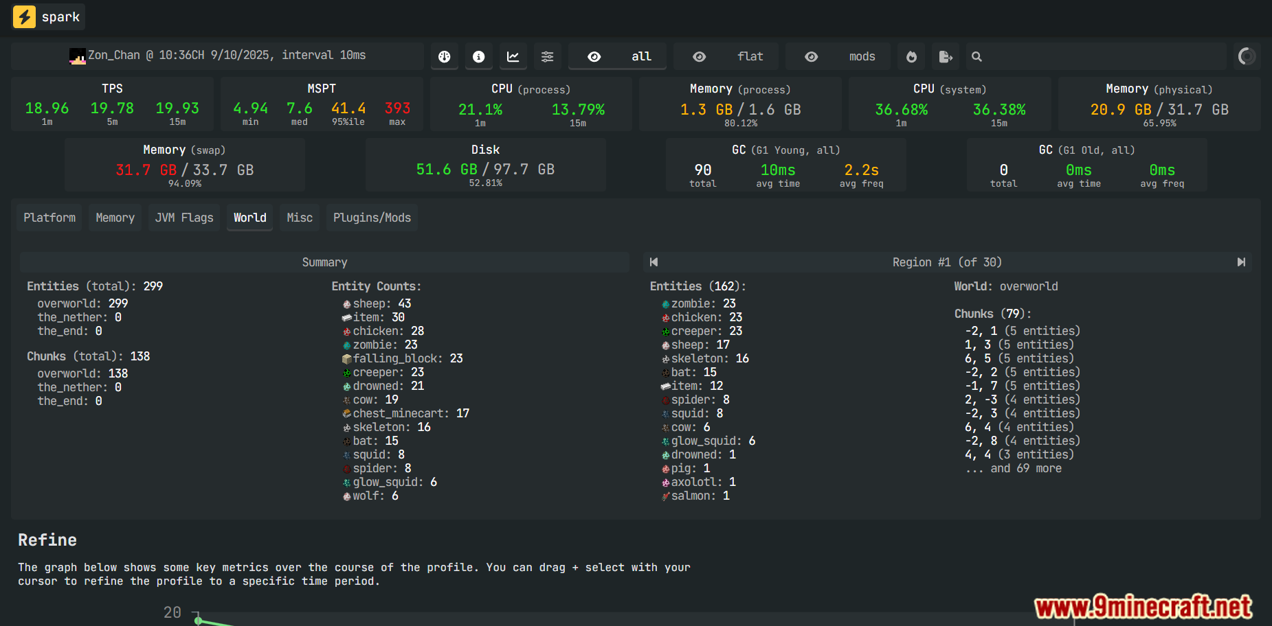 : Analyzes memory usage and provides a link to view the list of memory-consuming processes, which can help identify problematic mods or items./spark tps