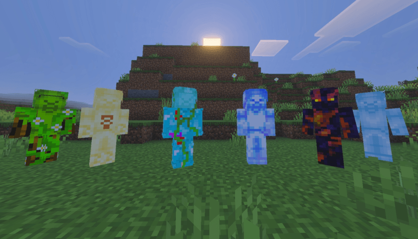 Steve Quest Reforged Addon (v26) is inspired by the short films about the character Steve. This expansion adds various colored Steves and enemies from the dark side. Steve characters can become teammates to support combat or protect the player. The system adds weapons such as spears and crystals, along with armor sets that reduce damage.