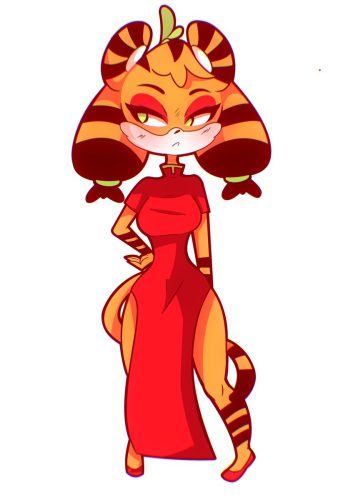 Dou Ellie Jenny Mod Model adapts Dou-Dou’s playful beastkin design with orange tiger fur, black/red stripes, perky ears and a fluffy tail, glowing red eyes, a loose red dress with…