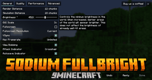 Sodium Fullbright Mod (1.21.10, 1.21.1) expands the maximum brightness setting in Sodium, raising the limit from 100% to 1000%. Features: Extends Sodium brightness cap from 100% to 1000% Modifies only…