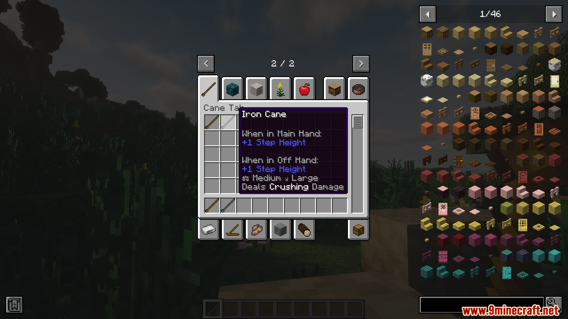 TFC Canes Mod (1.21.1, 1.20.1) adds two cane items wooden and iron that negate the movement penalties normally caused by long grass and snow.