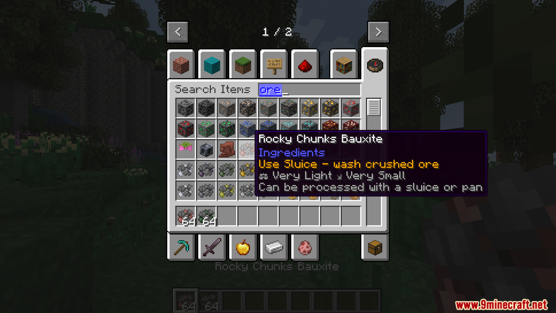 TFC Ore Washing is a mod that extends the ore processing process for TerraFirmaCraft (TFC) with grinding and washing technology through Sluice – a forgotten mechanism from the old TFC. Raw ore now has to go through 5 stages to be smelted. The mod integrates FirmaLife, TFC IE Addon, supports Create & Immersive Engineering, blocks raw ore smelting, and only increases the material by 7-25% to keep the balance.