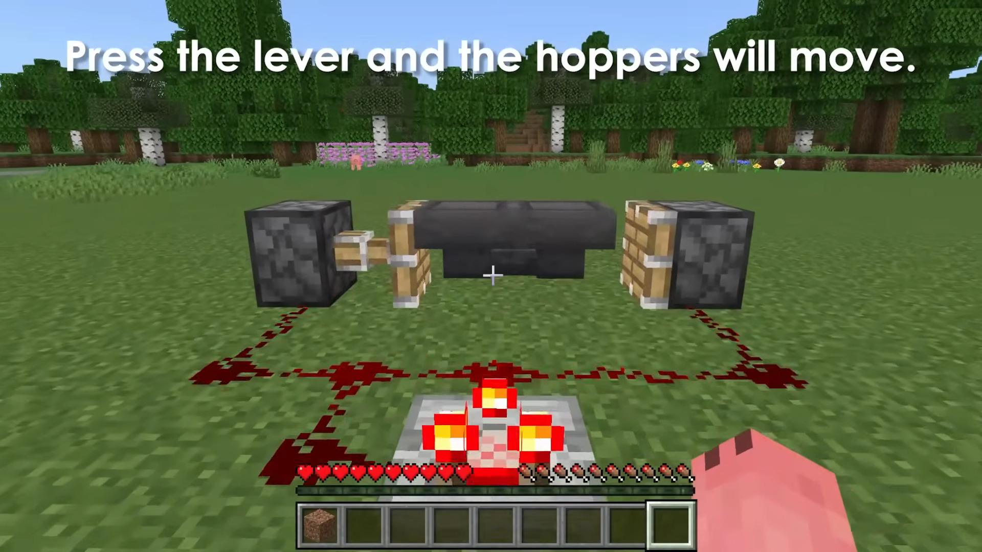 - Flip the lever to activate the redstone circuit. The pistons will pulse according to the comparator/loop and the hopper behavior shown in the images.