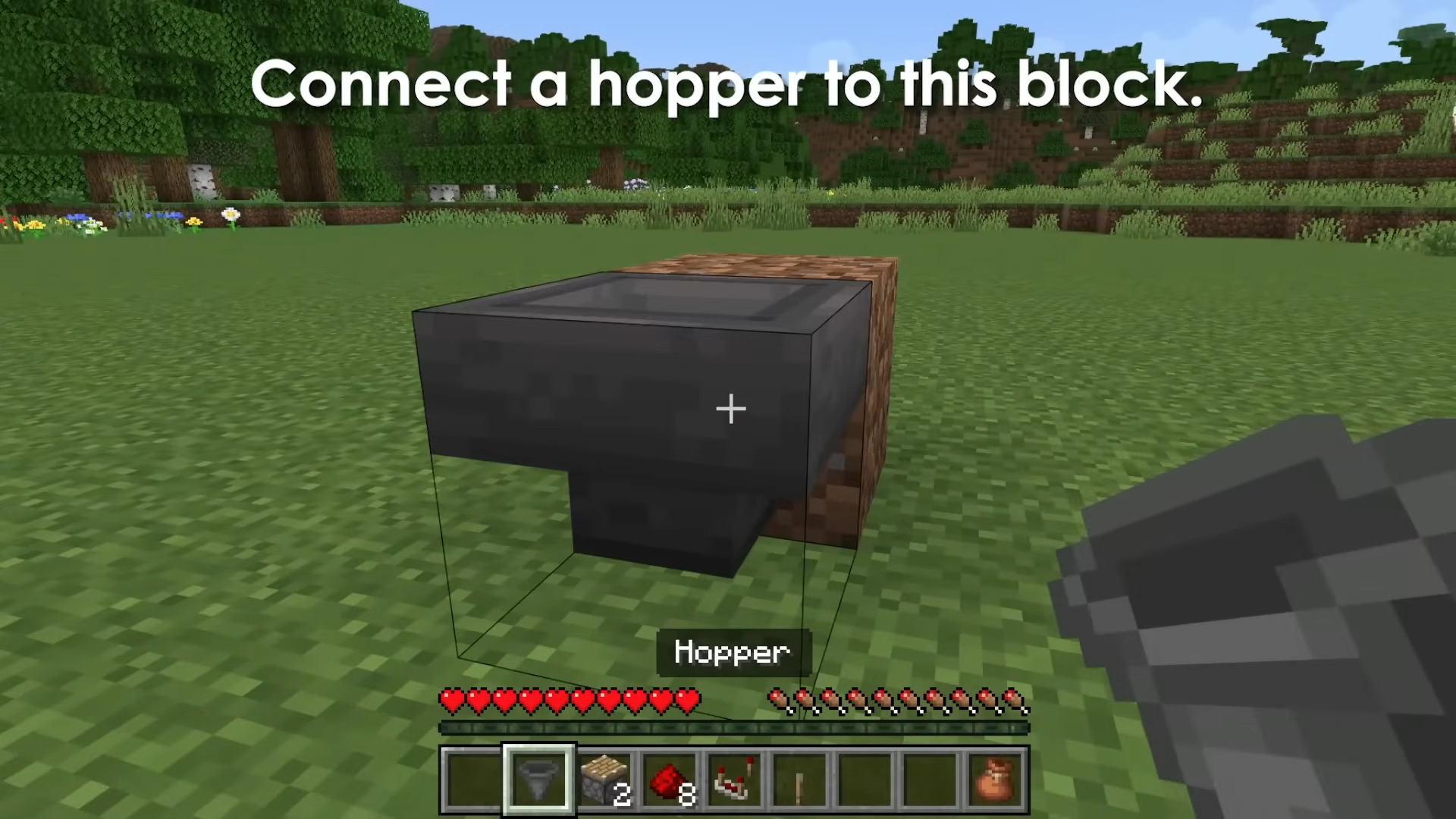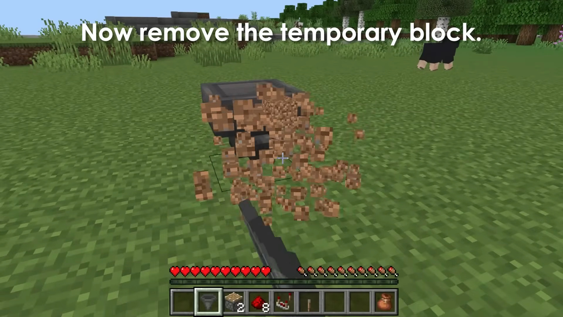 - Connect a hopper into that temporary block (sneak-click so the hopper points into the block).