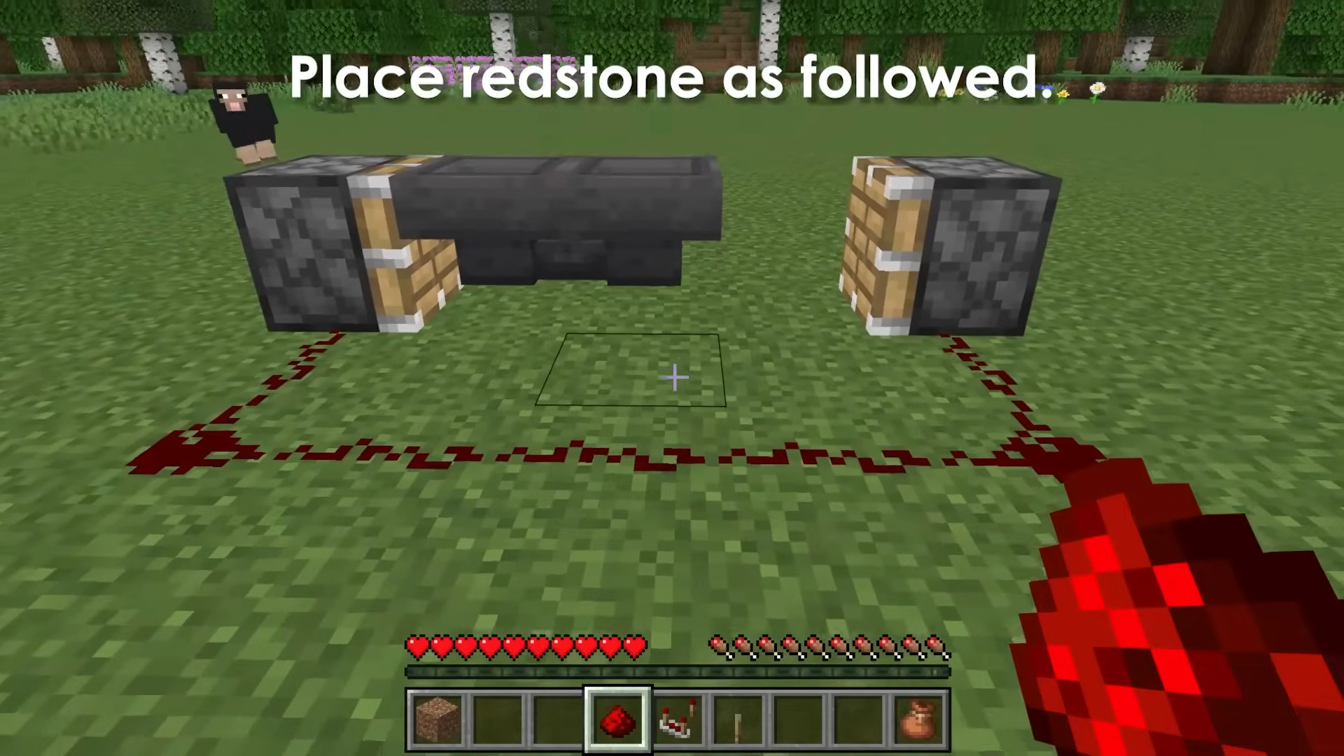 - Lay redstone dust around the pistons/hoppers following the layout shown in the images to form a looped circuit.