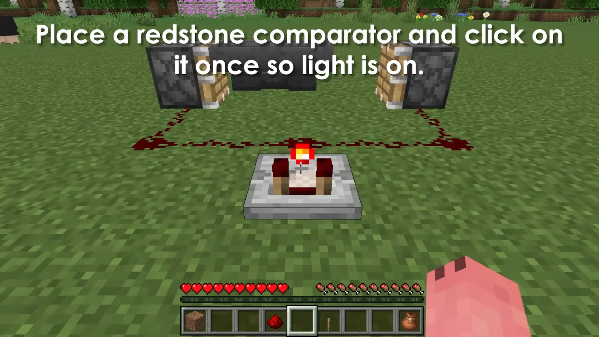- Place a redstone comparator in the position shown and right-click it once so its front torch lights (comparator in comparison mode with the indicator on).