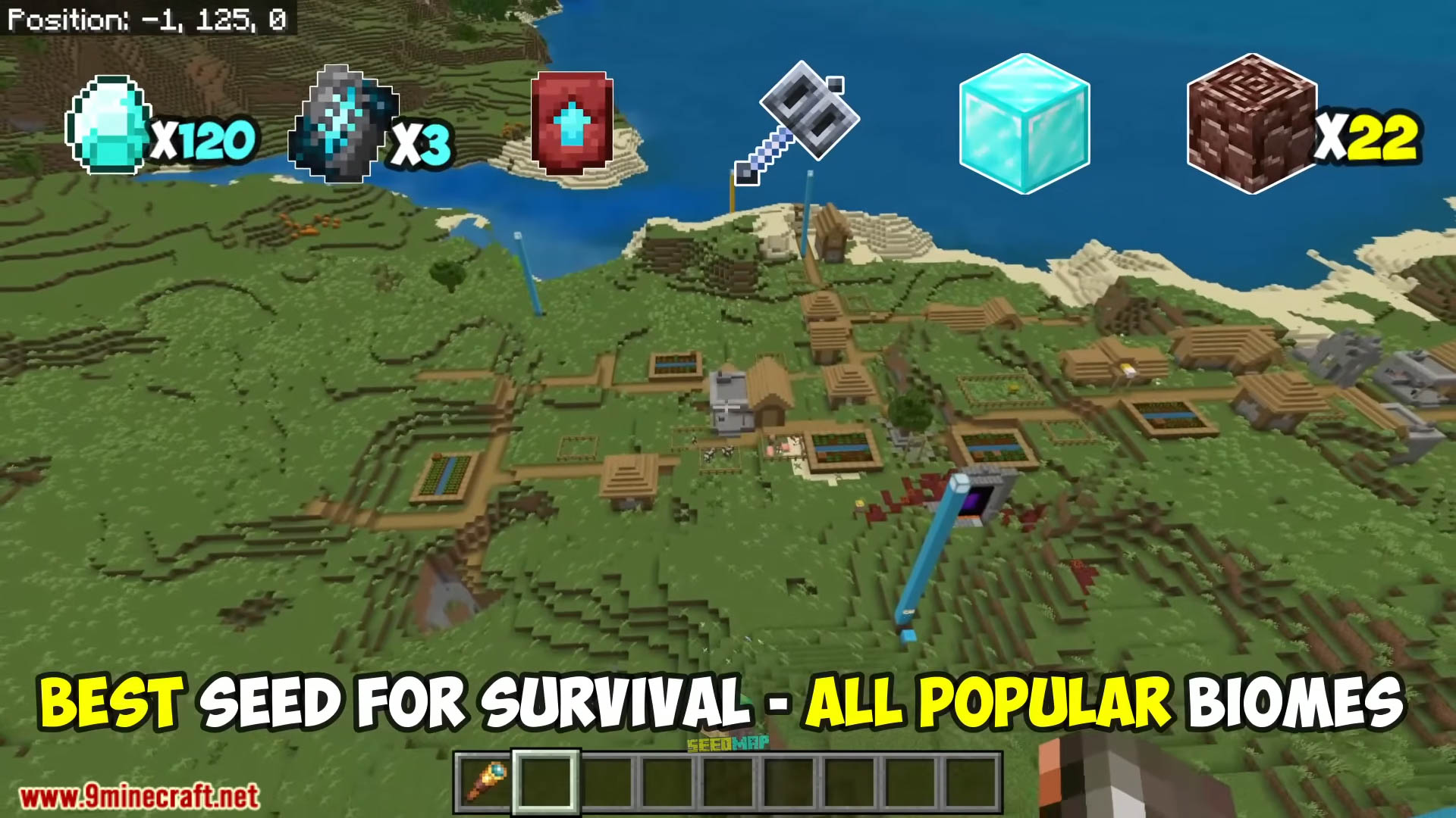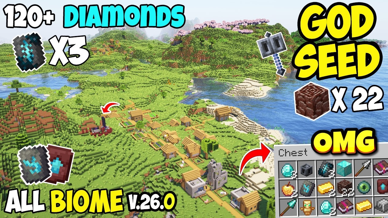 Ultimate Starter Survival Seeds are packed with everything a beginner needs for an epic adventure. These seeds spawn you near multiple blacksmith villages, a ruined portal, and buried treasures, giving you quick access to tools, armor, and resources. You’ll also find trial chambers with powerful rewards like an overpowered mace, plus 120+ diamond ore locations and mob spawners that can drop rare enchanted golden apples. Explore every major biome-from cherry groves and jungles to snowy plains, deserts with temples, swamps, and mangroves-while discovering woodland mansions, ancient cities with rare armor trims, and lush caves. Follow the ruined portal to reach a Nether fortress with valuable loot, and uncover stronghold libraries full of enchanted books. In the End, three End ships each hold an Elytra, making this seed one of the best for survival beginners who want rare loot, powerful gear, and endless exploration opportunities.