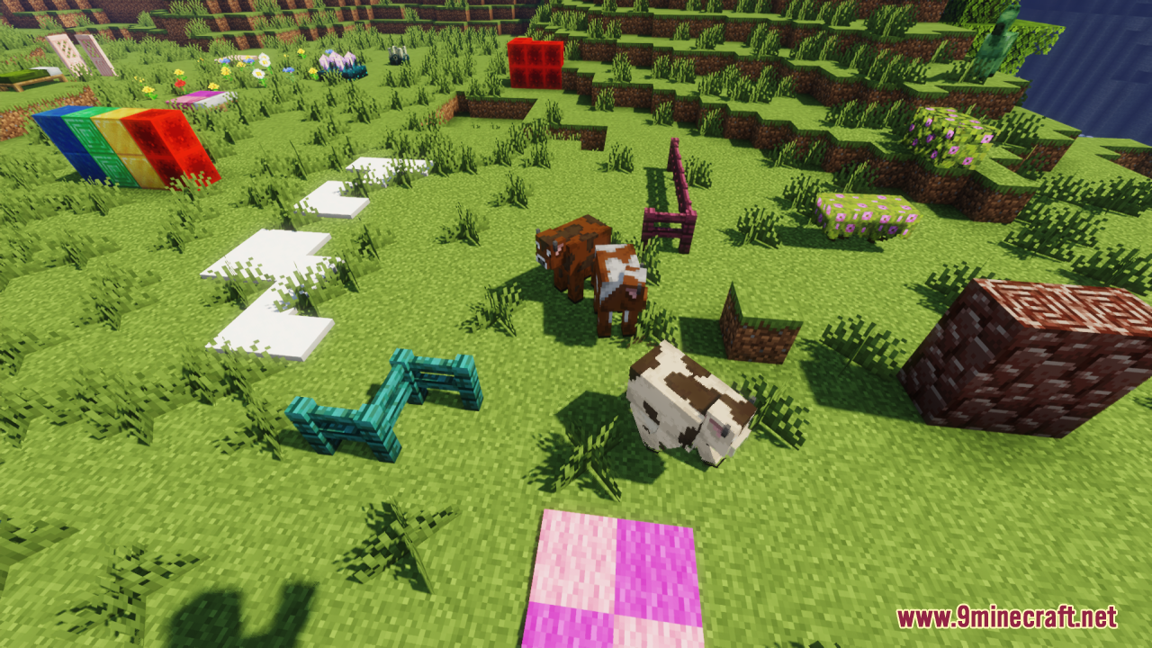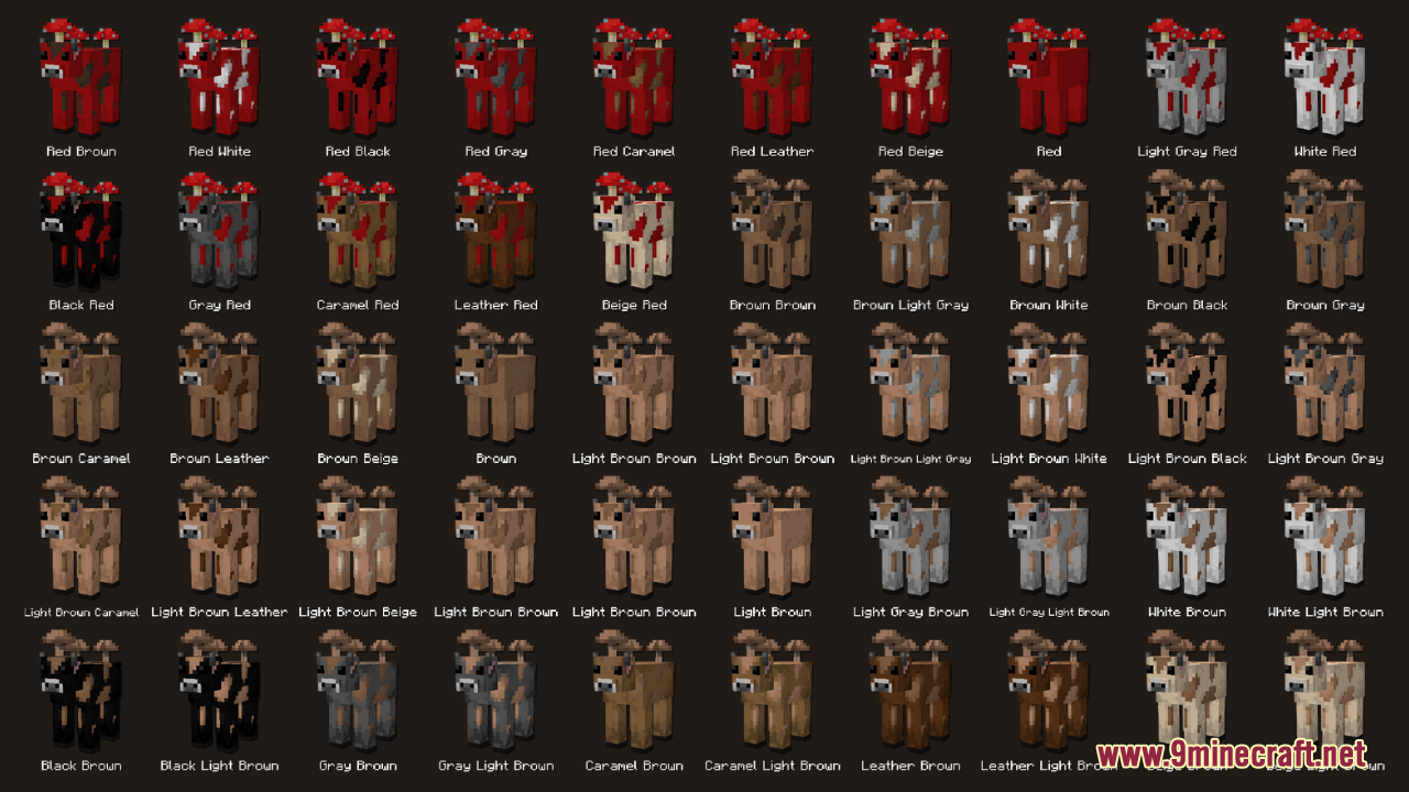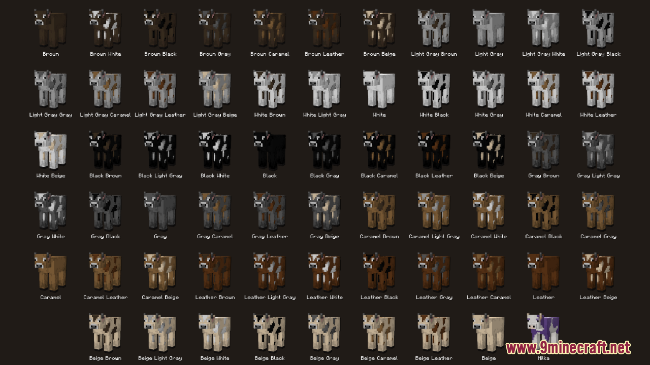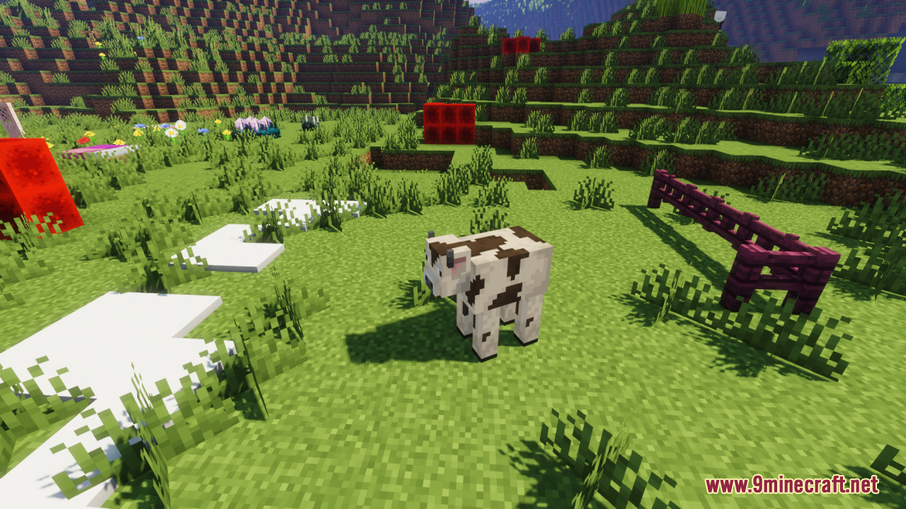 Undopia Cow Skins Resource Pack (1.21.11, 1.20.1) replaces the default cow (and mooshroom) textures with a large variety of new skins – offering 64 unique cow skins, 15 red mooshroom skins, and 33 brown mooshroom skins. This means when you wander a world with this pack, you’ll see many different-looking cows and mooshrooms instead of the standard identical ones, adding variety and freshness to animal populations. Because it only changes textures, it remains lightweight and compatible with other texture packs – good if you want custom cow visuals without sacrificing performance or drastically changing the overall style.