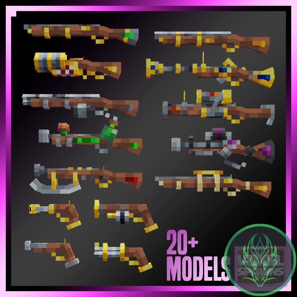 Variety Guns Modelincludes 21 firearm models. You can use them as custom crossbow models or implement them as weapons using the weapon plugin. A maximum of 20 elements per item ensures high FPS and easy operation. The models are included as crossbows for the Resourcepack, Oraxen, and Itemsadder. These weapons are only available through the Mythic Crucible!