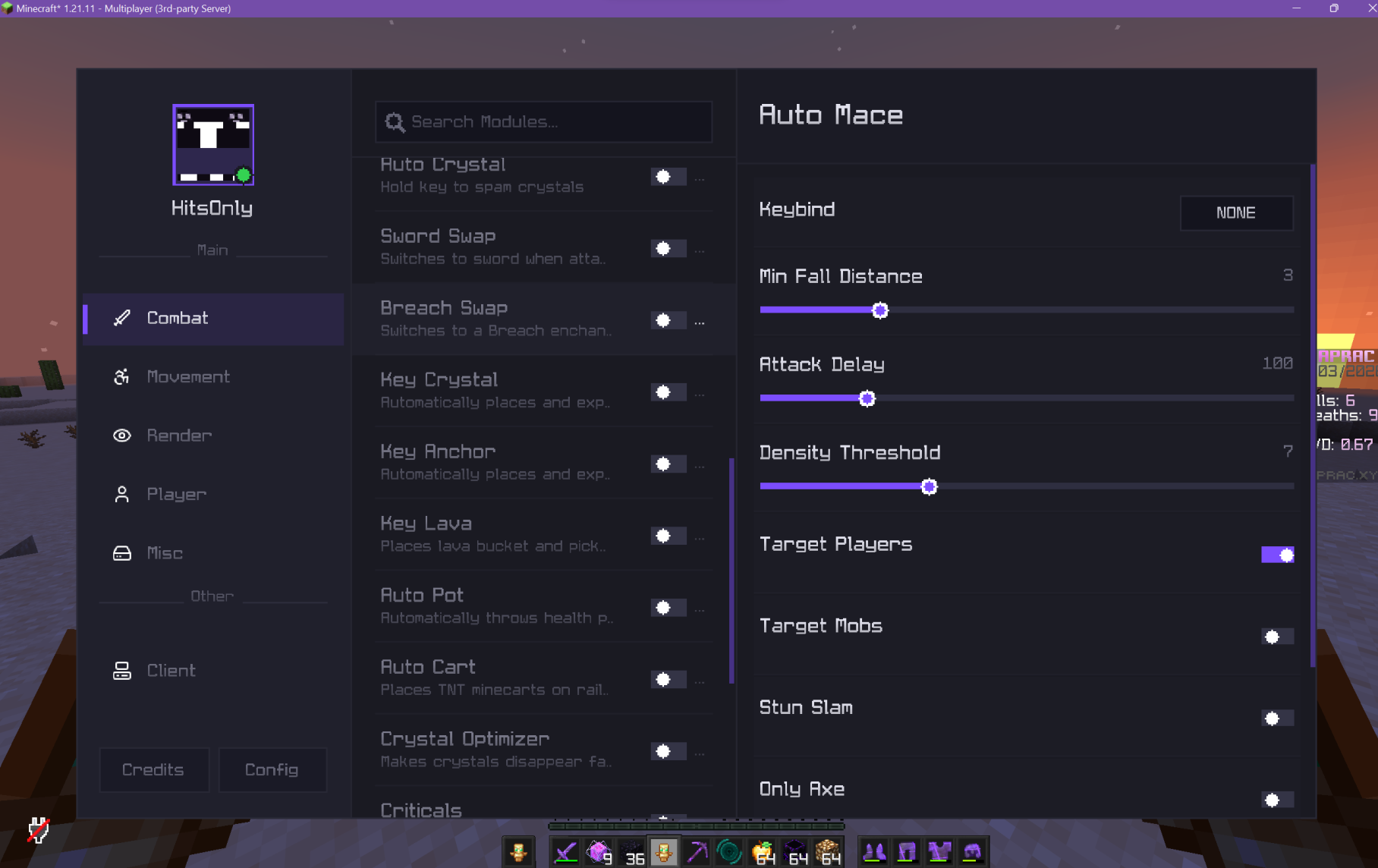 - Auto Mace Combat: Advanced mace attack automation with configurable attack delay and fall distance.