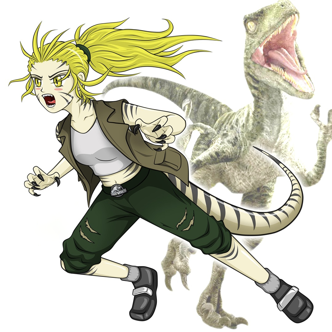 Velociraptor Kobold Jenny Mod Model turns Kobold into a predatory raptor figure, blending her playful personality with velociraptor traits from paleo-mods like JurassiCraft, featuring gray scaly skin, yellow slit eyes, a snarling muzzle, blue feather accents on the head and arms, and a feathered chest wrap for a primal, avian-theropod vibe.