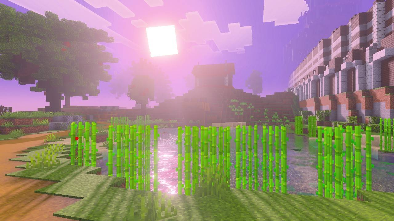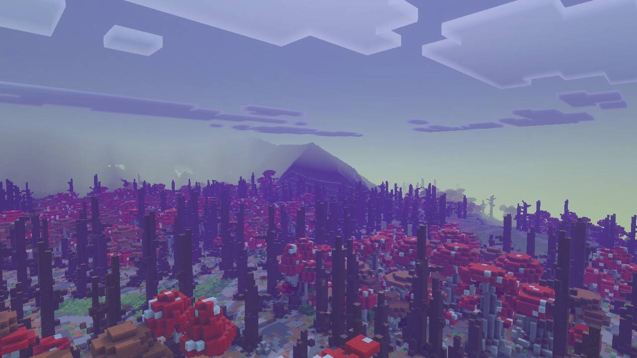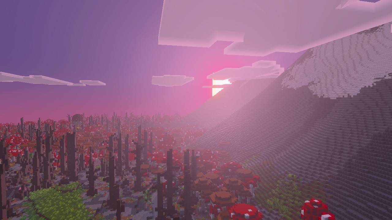 Velora Visuals Shader (1.21) transforms the imagery into a fantasy style with purple and pink tones. High-intensity sunlight and layers of fog add depth to the landscape.