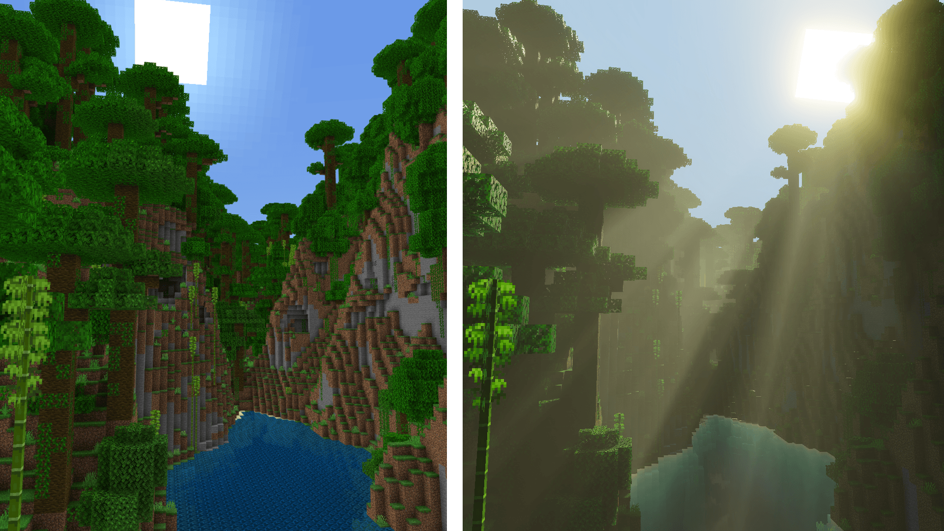 Vibrant Realism PBR Shader alters the visuals and lighting on the Bedrock texture. The system creates distinct sunlight and shadows. Water surfaces have a smooth reflection effect, and ambient light is improved. This package works well with PBR texture types.