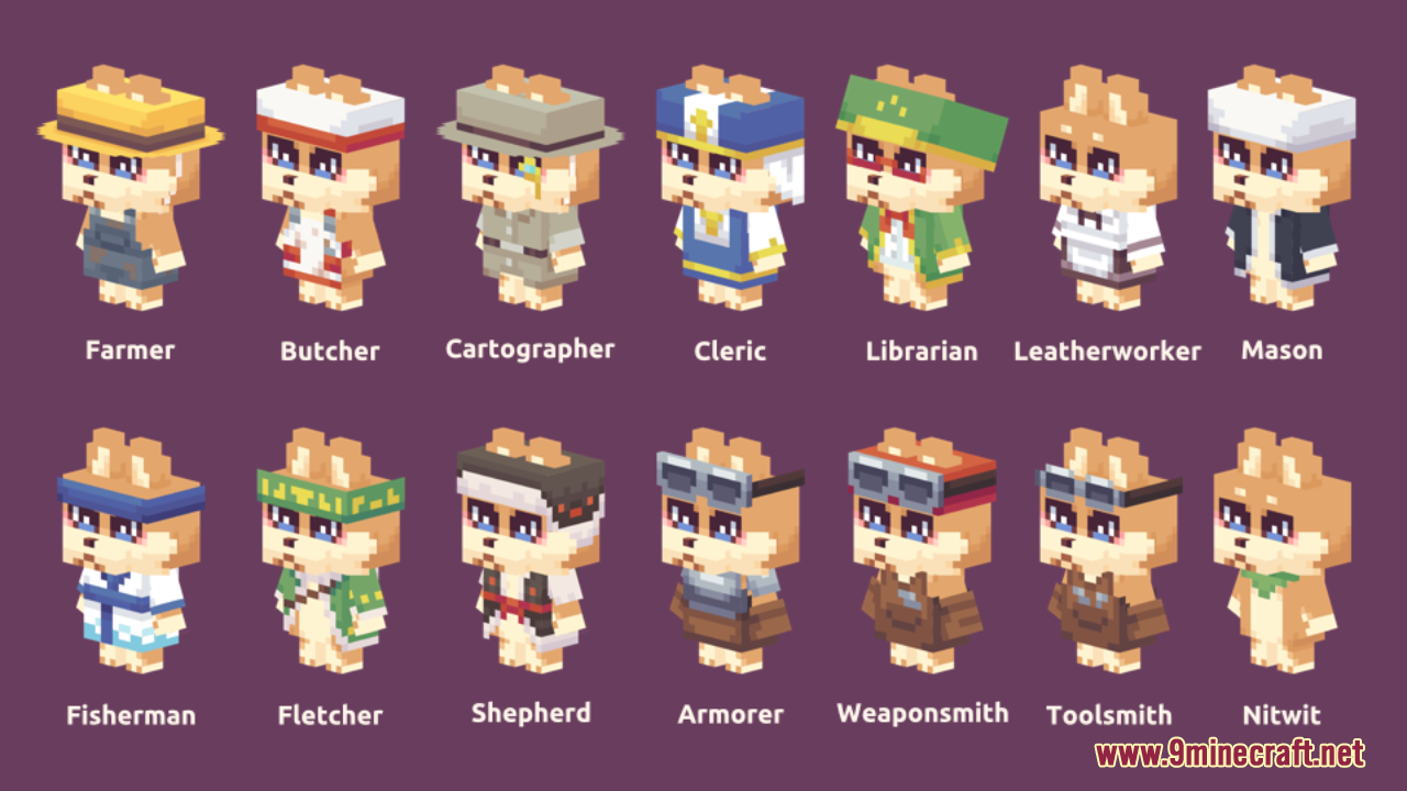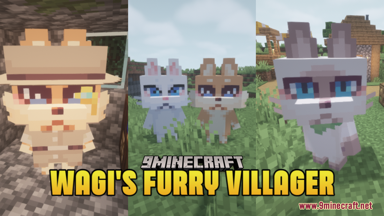 Wagi’s Furry Villager Resource Pack (1.21.9, 1.20.1) is a whimsical resource pack that transforms villagers, zombie villagers, and wandering traders into cute animals. It’s not just cosmetic — it requires ETF (Entity Texture Features) and EMF (Entity Model Features) to function properly, meaning it uses custom entity skins/models rather than just flat textures.